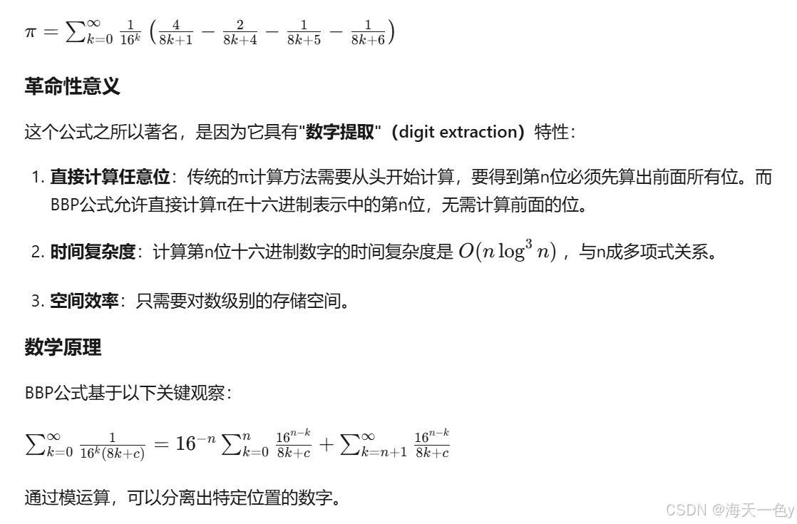 原理:可直接计算π的第n位十六进制,无需计算前面各位。