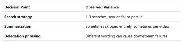 即使 temperature=0 加固定 seed,调用次数仍有 10 次的波动(25 到 35 次)。不可预测性的根源不是采样随机性,而是 LLM 在每次运行中做出了不同的、但都合理的策略选择:发几个并行搜索(1、2 还是 3)、按视频分别摘要还是合并摘要、要不要跳过摘要让 writer 直接综合。