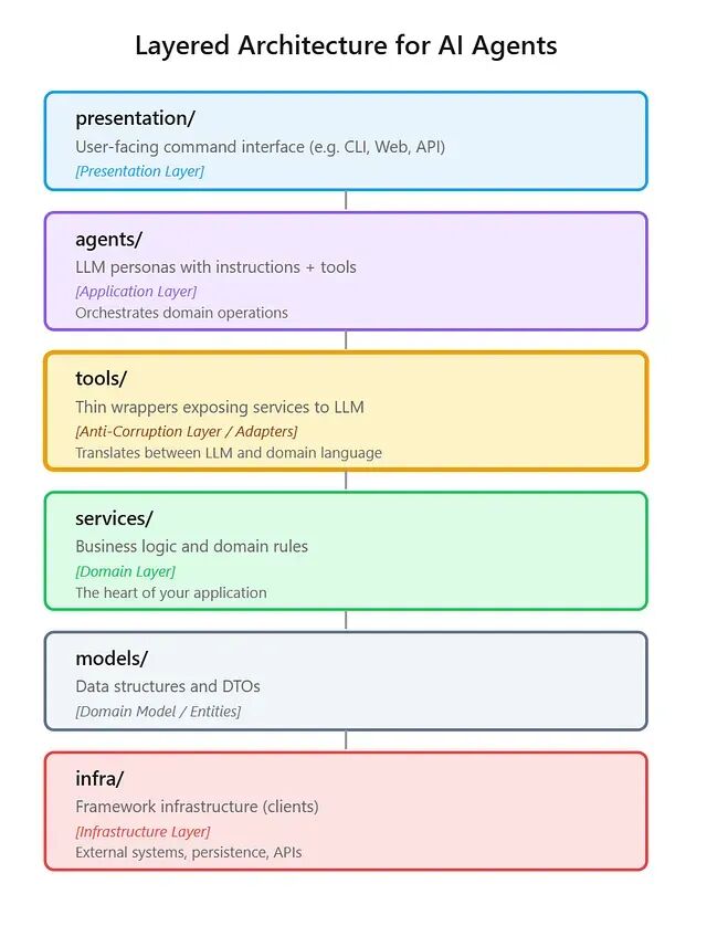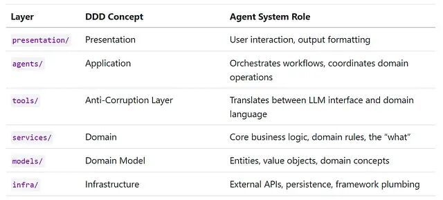 方法本身谈不上新颖。分层架构、关注点分离、领域驱动设计,全是老话题。不过可以看到它们映射到智能体系统时几乎是天然契合的。