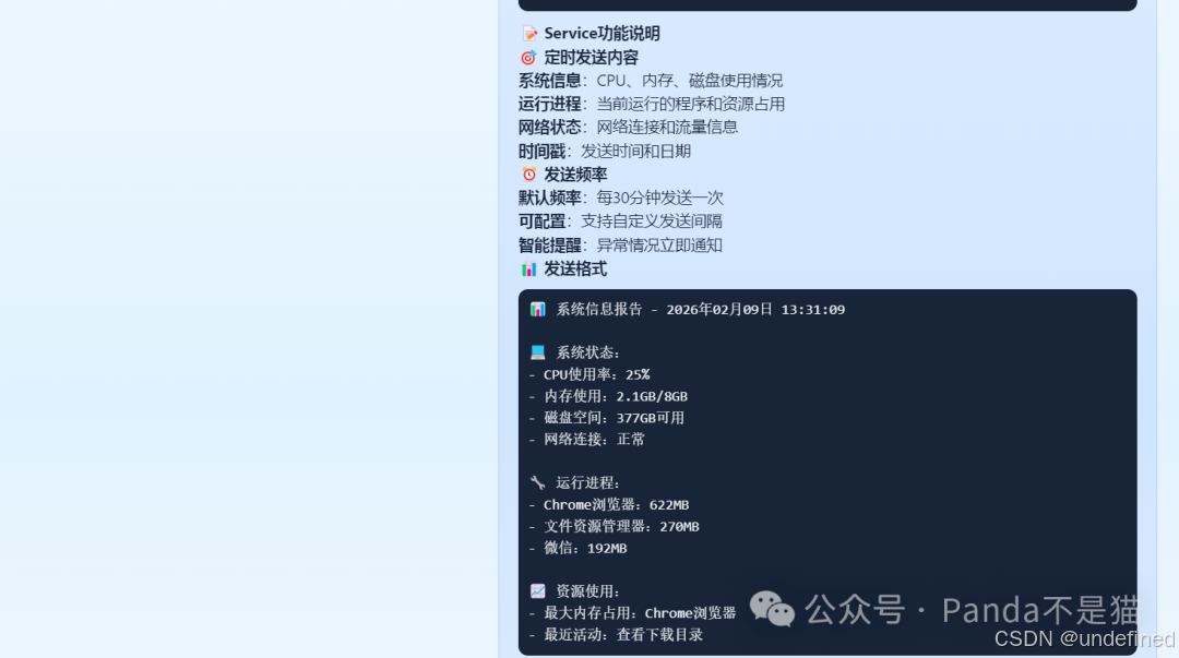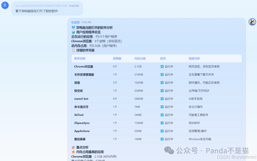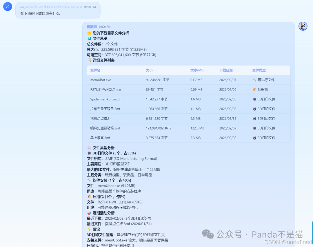 你可以让 AI 扫描指定目录。它不仅是列出文件名,还能分析文件类型、用途。甚至,你可以直接问它:"我电脑现在的内存占用情况如何?"它会直接调用系统 API 反馈给你。