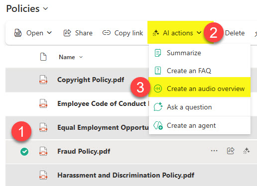 1.当我们在SharePoint文档库中有一个文档的时候,可以用AI功能,新建音频,如下图: