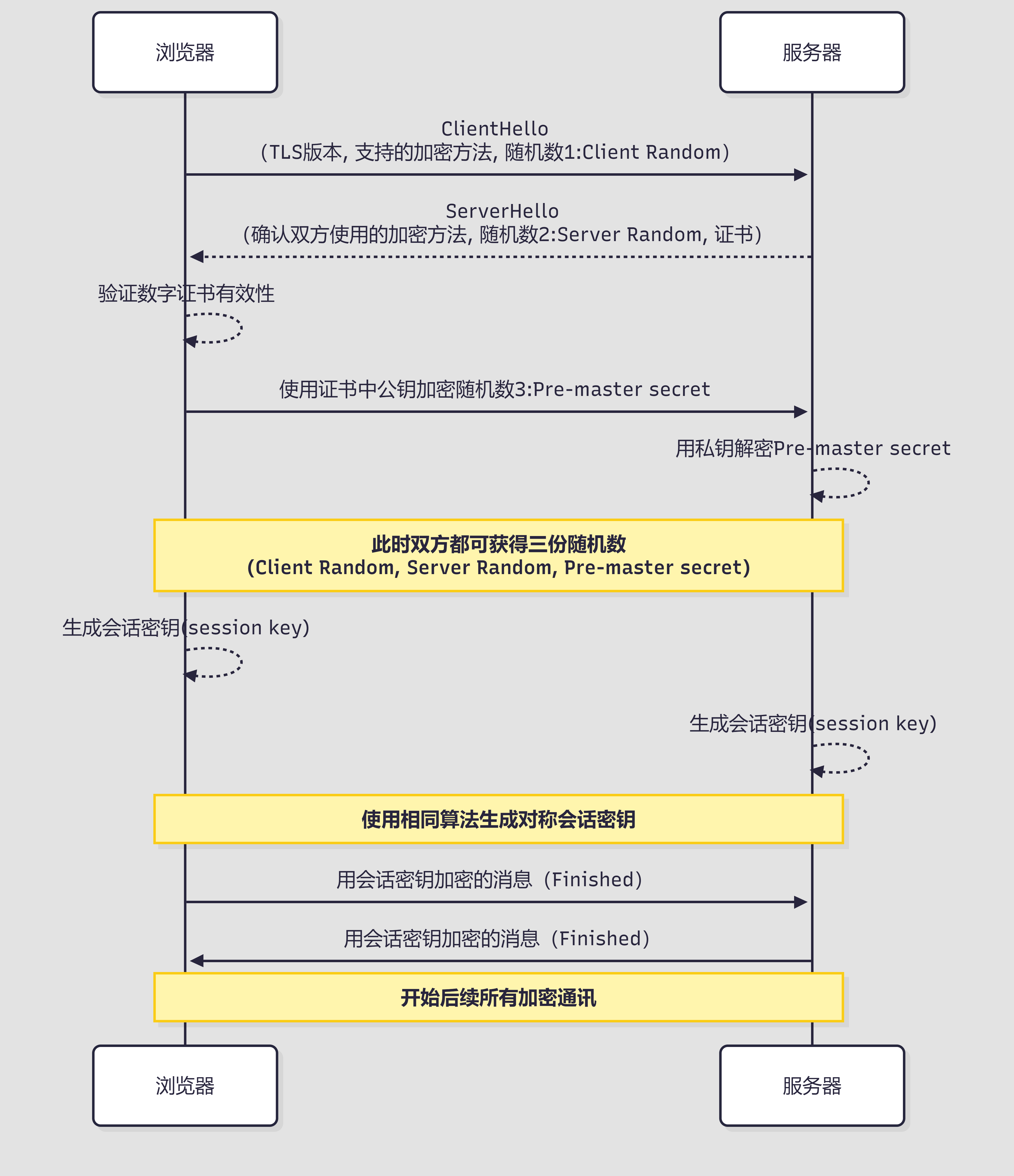 客户端->>服务器: 用会话密钥加密的消息(Finished)