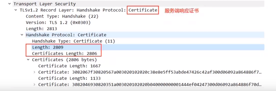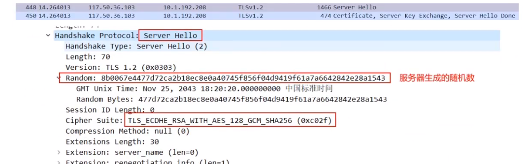 服务器确认双方使用的加密方法,并给出数字证书、以及一个服务器生成的随机数2(Server random)。(明文通信)