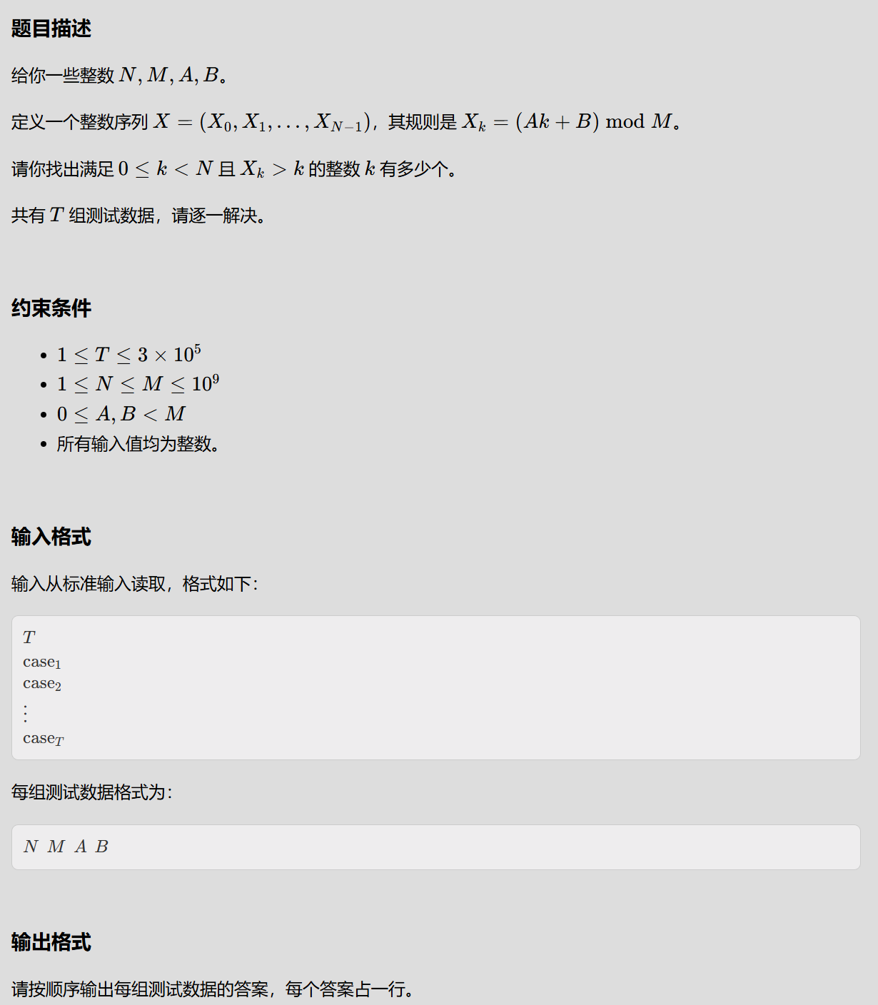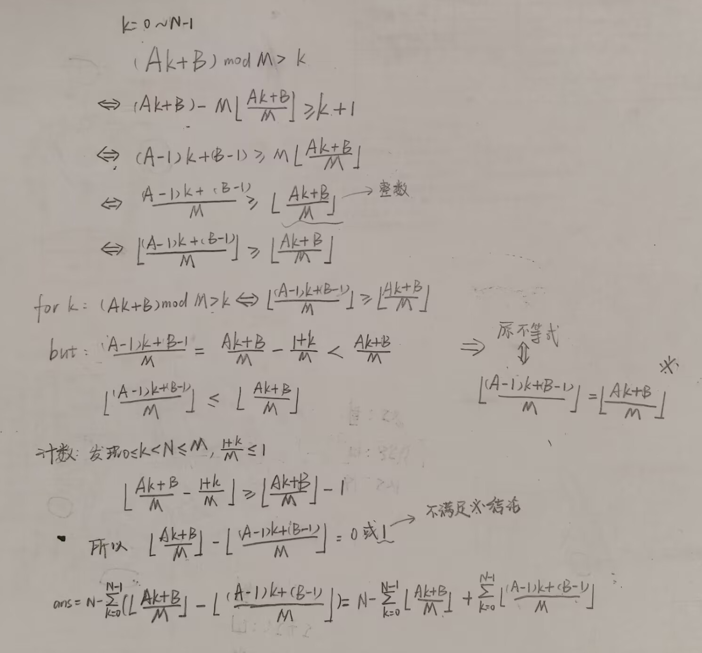 请你找出满足 0 ≤ k < N 0≤k<N 0≤k<N且 ( A k + B ) m o d M > k (Ak+B)\mod M>k (Ak+B)modM>k的整数 k k k有多少个。