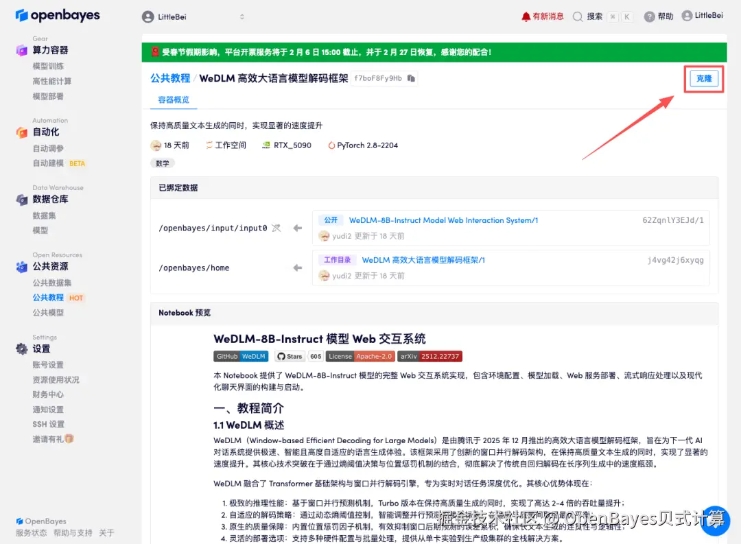 1.登录 OpenBayes.com,在「公共教程」页面,选择「WeDLM 高效大语言模型解码框架」教程。