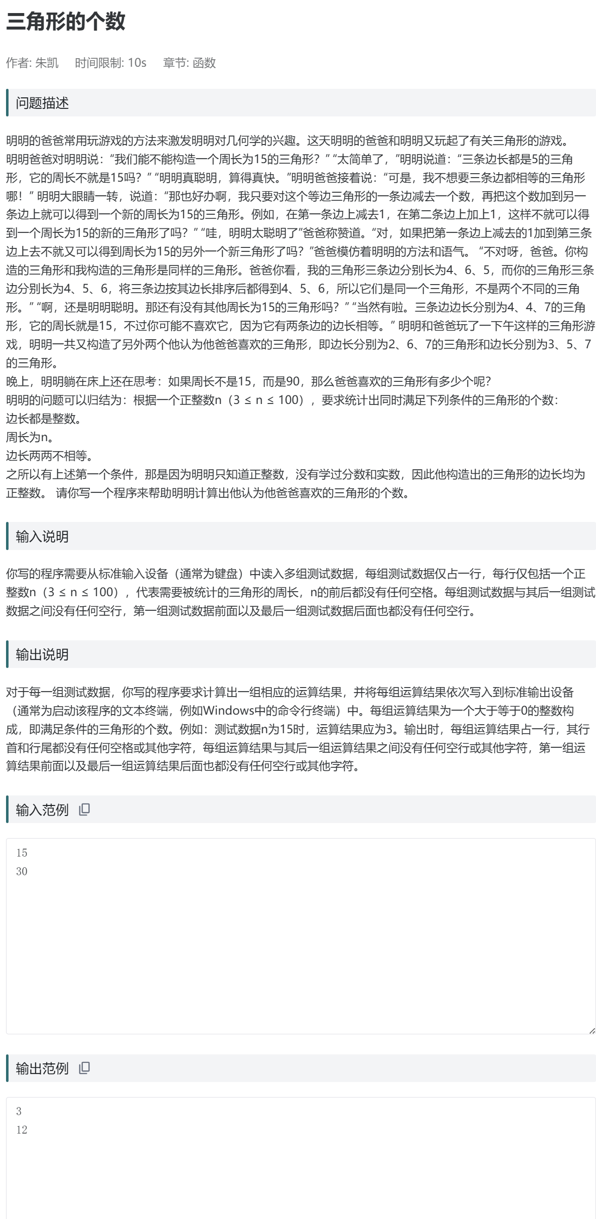 这道题相对容易,构成三角形的要求各边互不相等,还有隐藏条件最小的两边之和大于第三条边,可以通过控制两条边遍历,然后用周长来计算第三条边。判断时不符合条件就continue,接着遍历下一个。