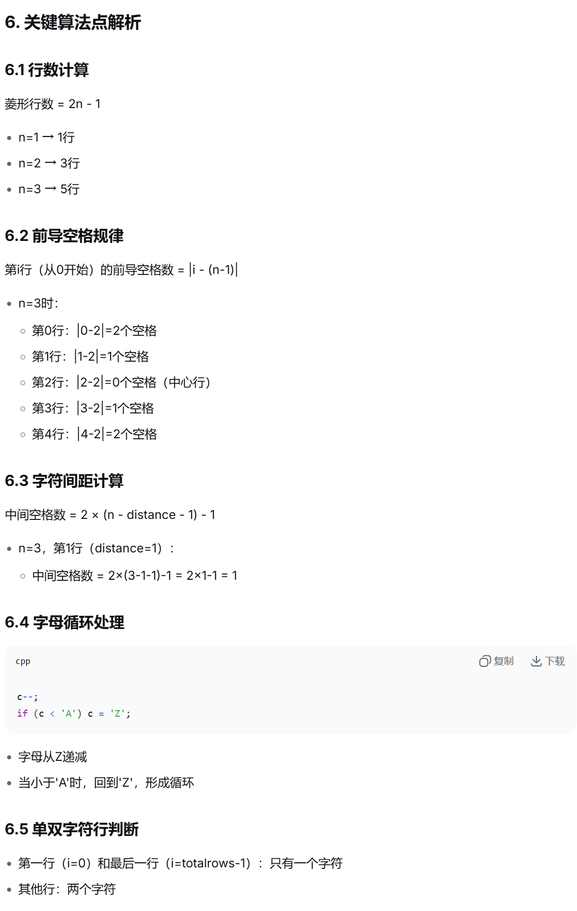 这道题比较困难,对于菱形的每一行需要控制空格以及字符的输出处理,对于整个菱形的输出也要控制,这里写成两个函数比较清晰。对于整个菱形就是计算出总行数,然后一行一行输出。行数、前导空格和字符间距这几个都需要通过找规律来写出通项式。