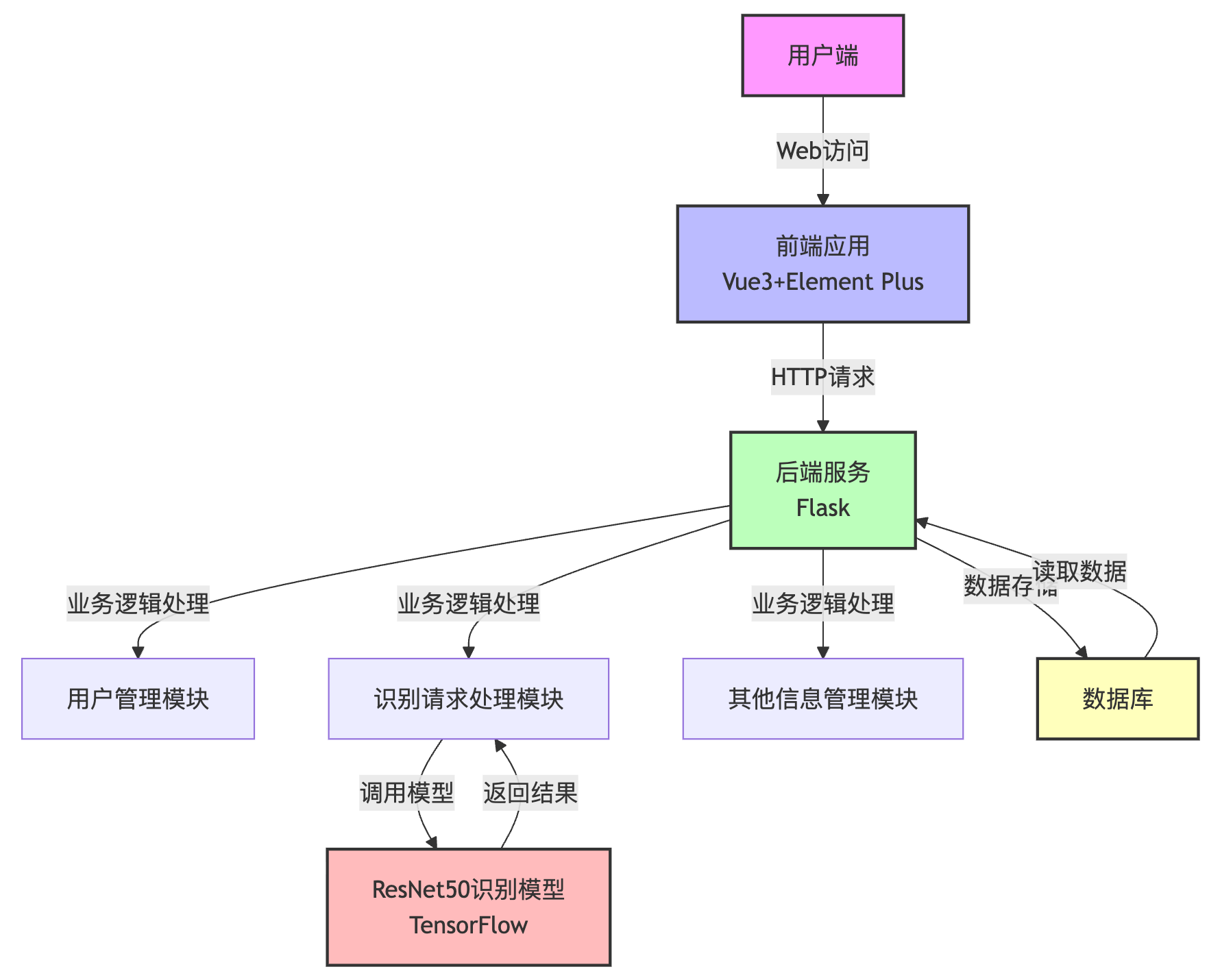 本植物识别系统是一款基于深度学习技术的智能植物识别应用,旨在帮助用户快速、准确地识别各类植物。系统采用前后端分离架构,前端使用 Vue3 框架结合 Element Plus 组件库,提供美观、直观的用户界面;后端采用 Flask 轻量级 Web 框架,负责处理业务逻辑和数据交互;核心识别算法基于 TensorFlow 框架实现的 ResNet50 深度学习模型,具备强大的图像特征提取和分类能力。
