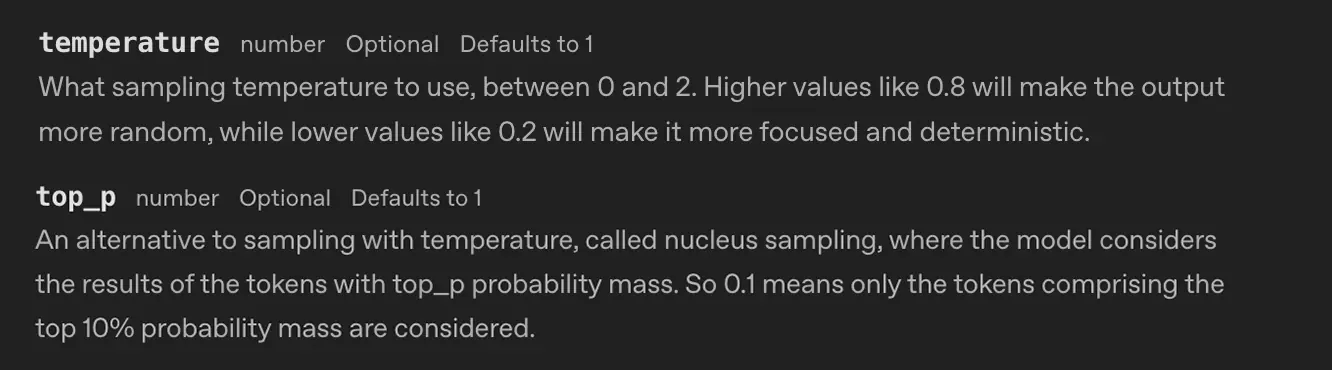 在AI时代,大语言模型(LLM)如 ChatGPT 或Gemini 已成为我们的"数字大脑"。如果你经常使用这些大模型,那你肯定见过Temperature 和 TopP 这两个参数。比如 ChatGPT 的API文档就有介绍: