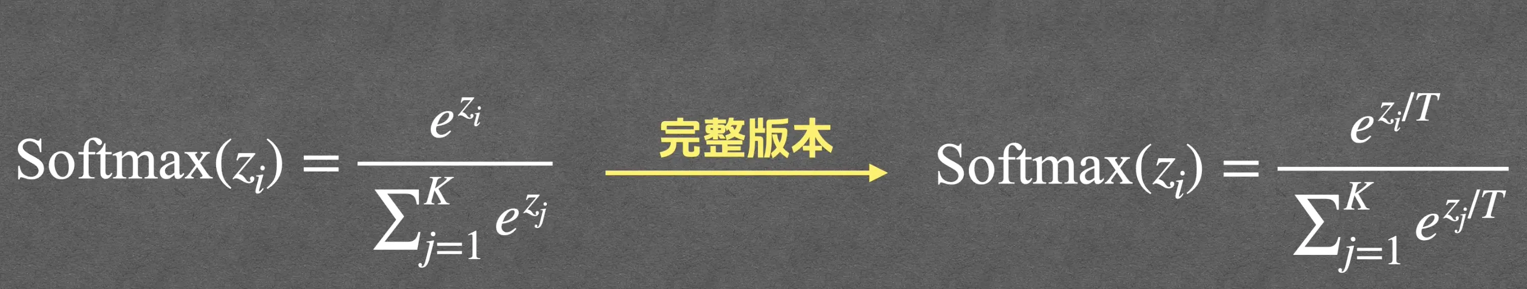 <math xmlns="http://www.w3.org/1998/Math/MathML" display="block"> Softmax ( z i ) = e z i / T ∑ j = 1 K e z j / T \text{Softmax}(z_i) = \frac{e^{z_i/T}}{\sum_{j=1}^{K} e^{z_j/T}} </math>Softmax(zi)=∑j=1Kezj/Tezi/T