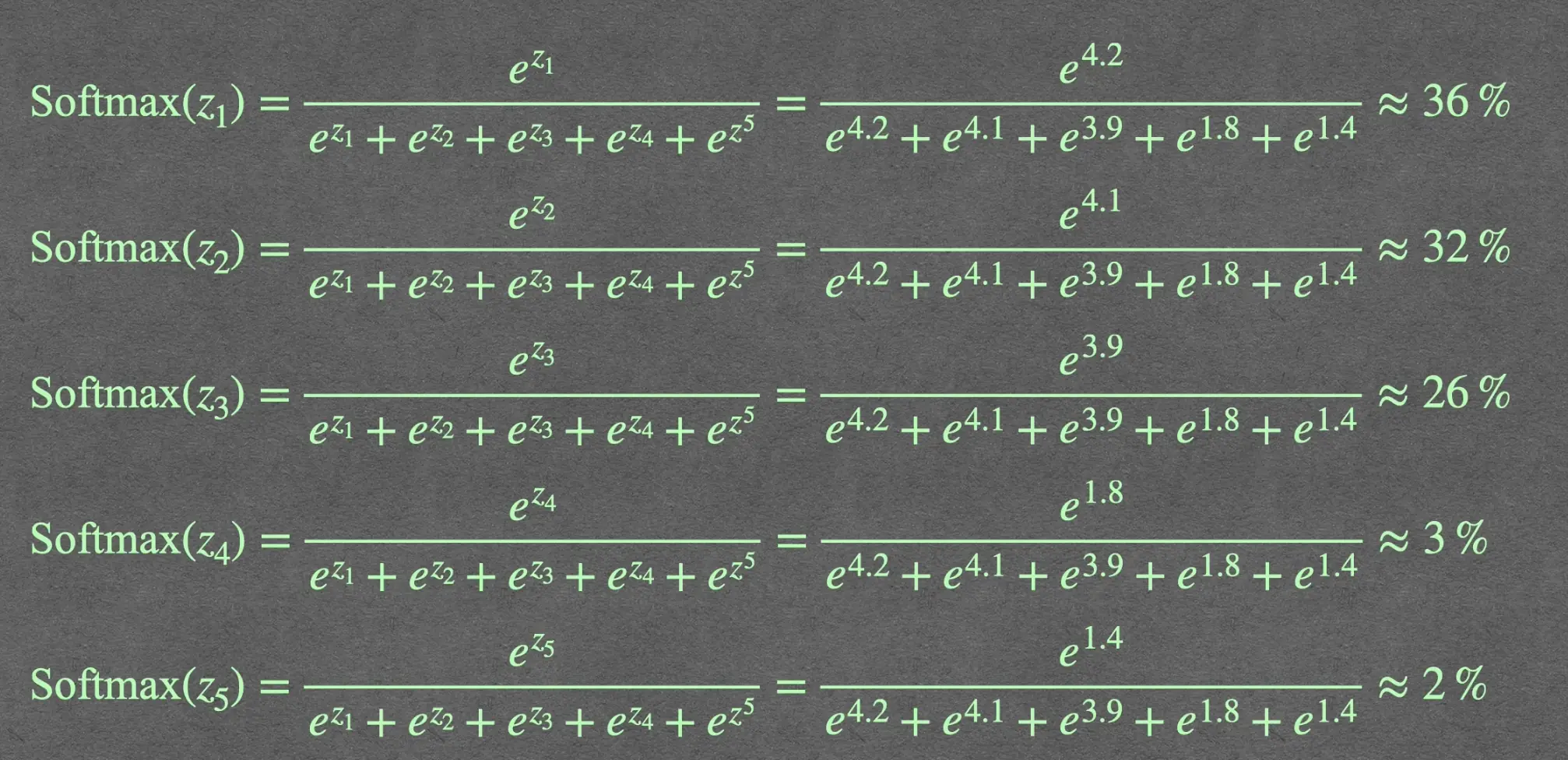 <math xmlns="http://www.w3.org/1998/Math/MathML" display="block"> Softmax ( z i ) = e z i ∑ j = 1 K e z j \text{Softmax}(z_i) = \frac{e^{z_i}}{\sum_{j=1}^{K} e^{z_j}} </math>Softmax(zi)=∑j=1Kezjezi
