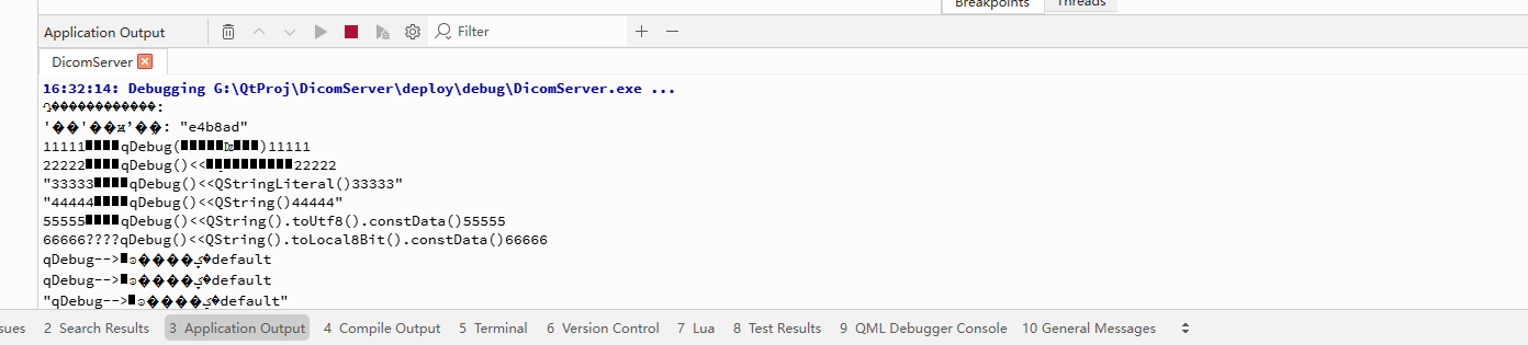 下图是Qt Creator 的 Application Output 面板,在没有启用Terminal窗口时,使用的是Application Output,在Qt Creator里面调试启动项目时,有可能出现显示的汉字是如下图所示的黑方块,因为在调试模式下使用的字体不支持这些字符(俗称 tofu 方块);