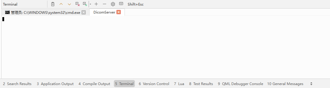 上述1或2任意一个没有设置,都不会弹出电脑内置的控制台程序,如下图所示,程序输出仍在Qt Creator的Application Output窗口,而Terminal窗口没有任何输出