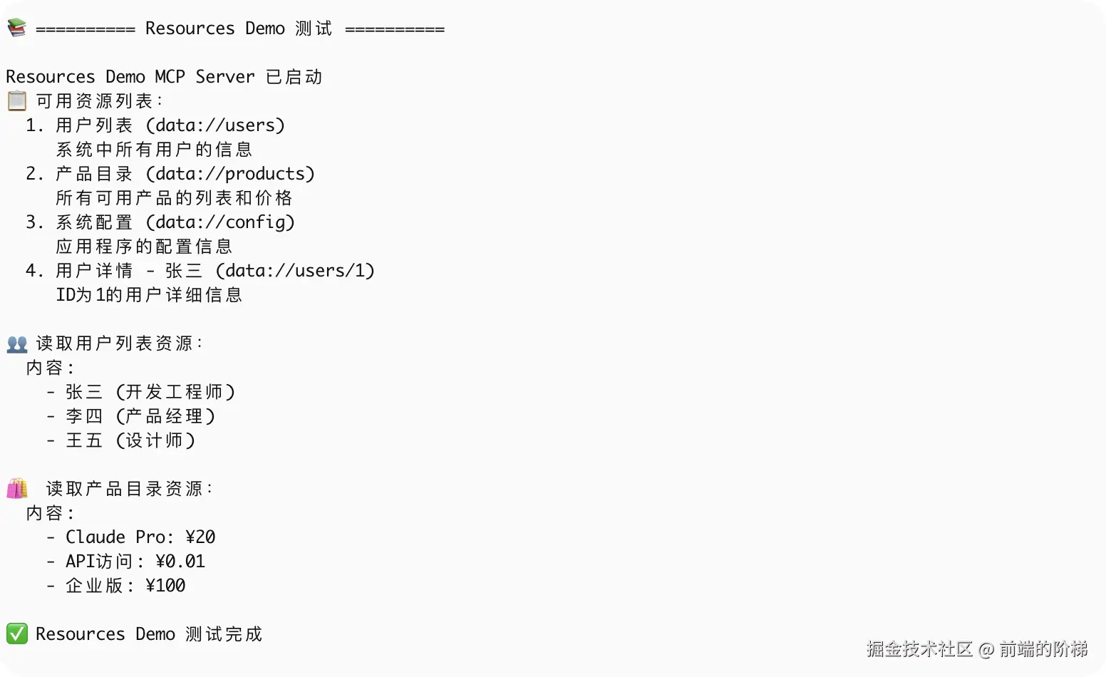 支持资源的 MCP Server 需要在初始化阶段声明能力,例如:
