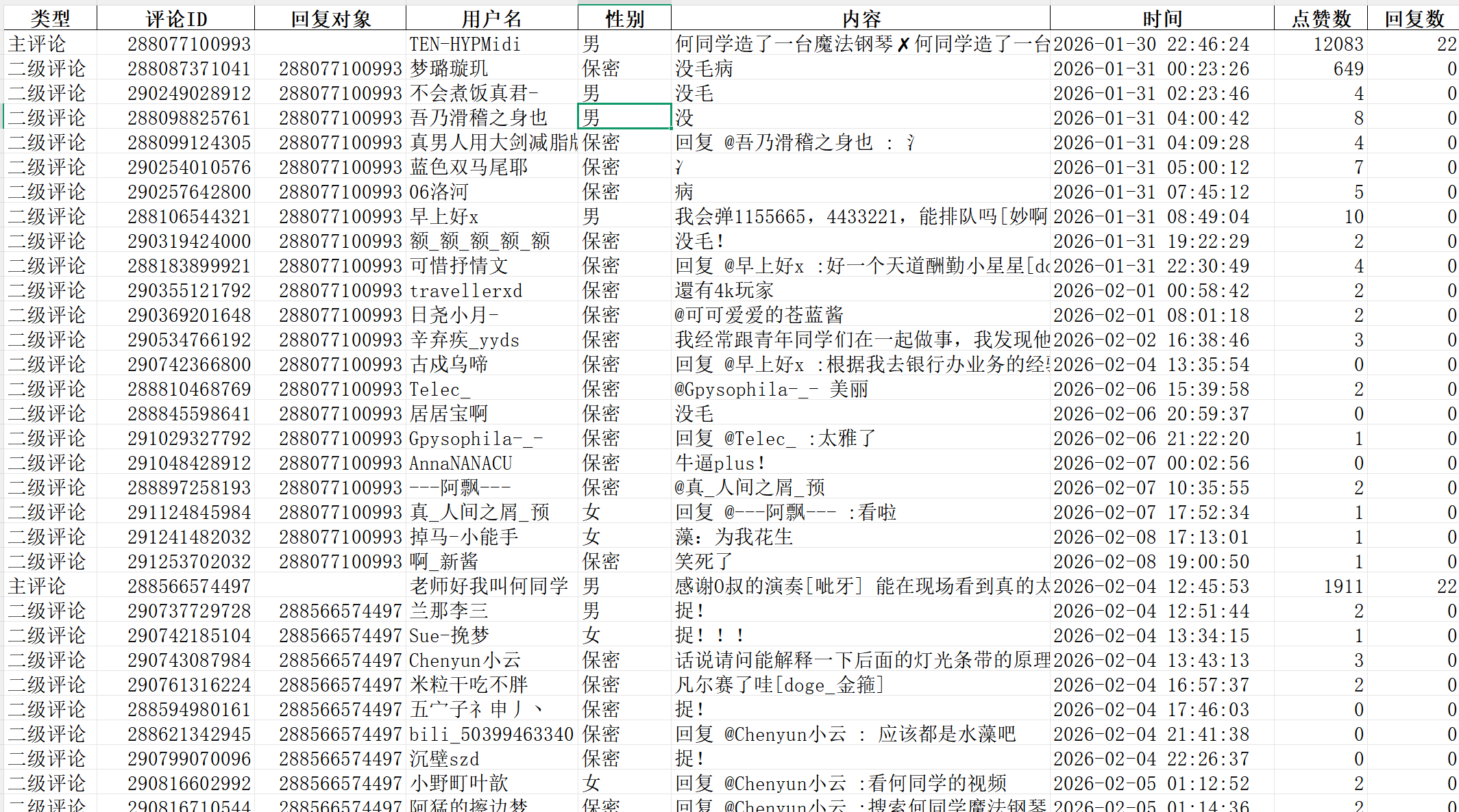 字段:类型,评论ID,回复对象,用户名,性别,内容(一二级),时间,点赞数,回复数。