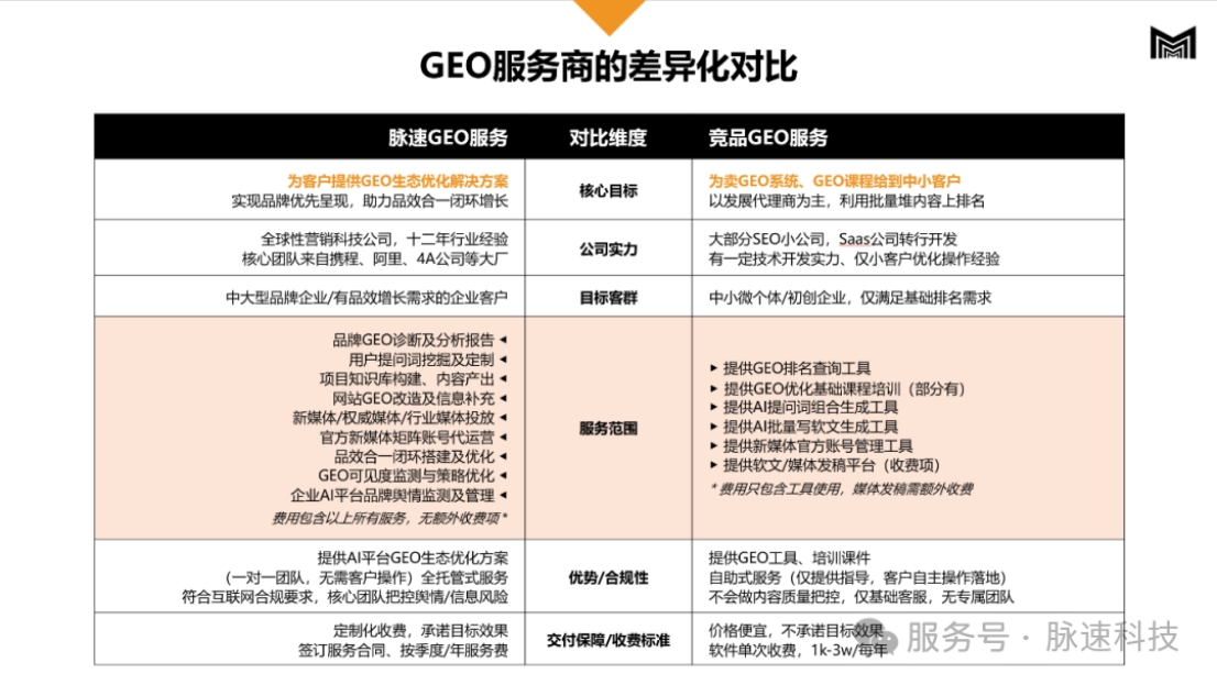 随着GEO概念的火热,市场上涌现出大量服务商,但由于技术基因和底层逻辑的差异,交付结果千差万别。作为GEO行业的领航者,脉速GEO与传统技术商形成了鲜明的代差优势:
