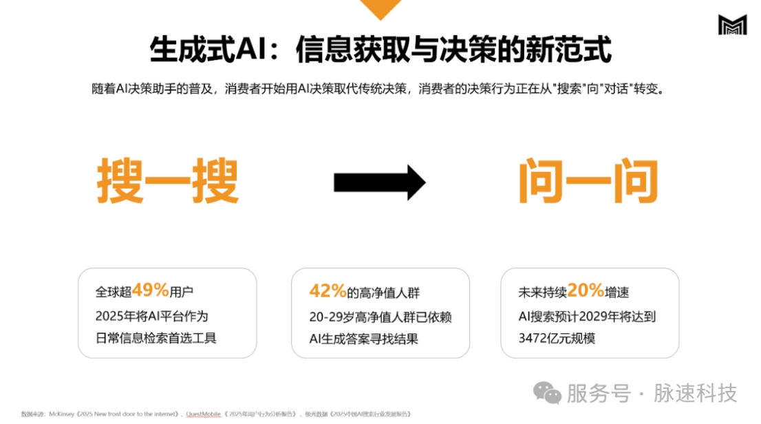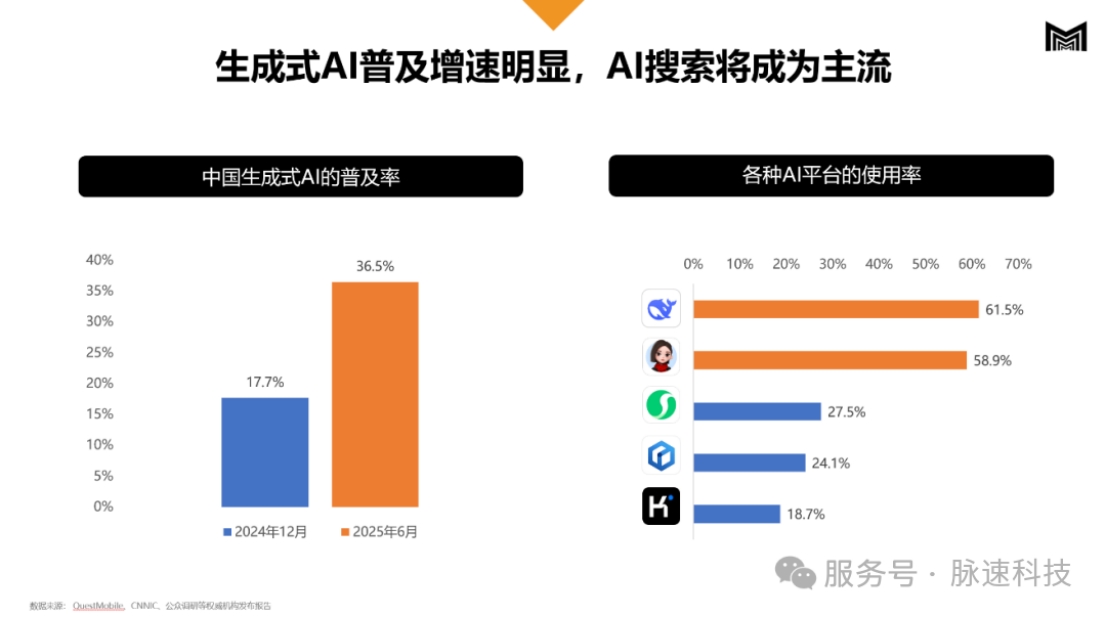 权威数据显示, 2025年6月,国内生成式AI普及率 已达36.5%,用户规模半年内激增106.6%至5.15亿。这意味着,消费者的决策行为正在发生根本性逆转:从主动搜索(Search)向智能对话(Chat)转变。