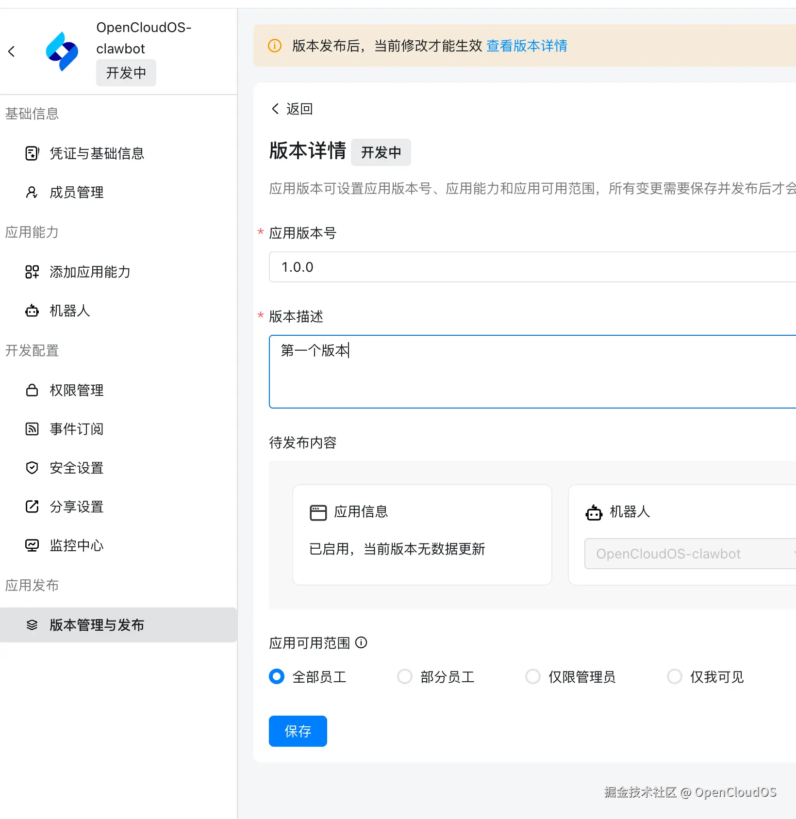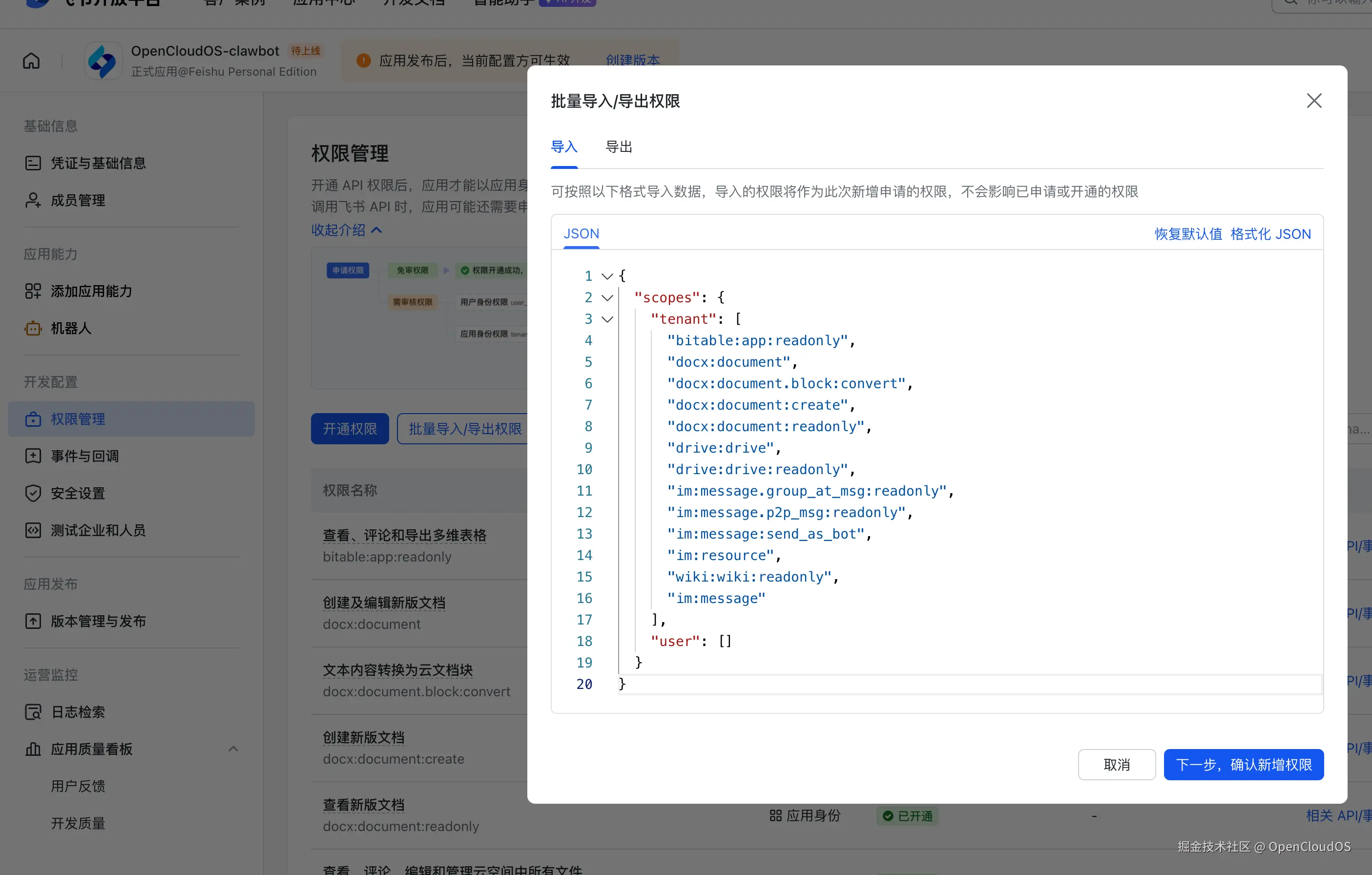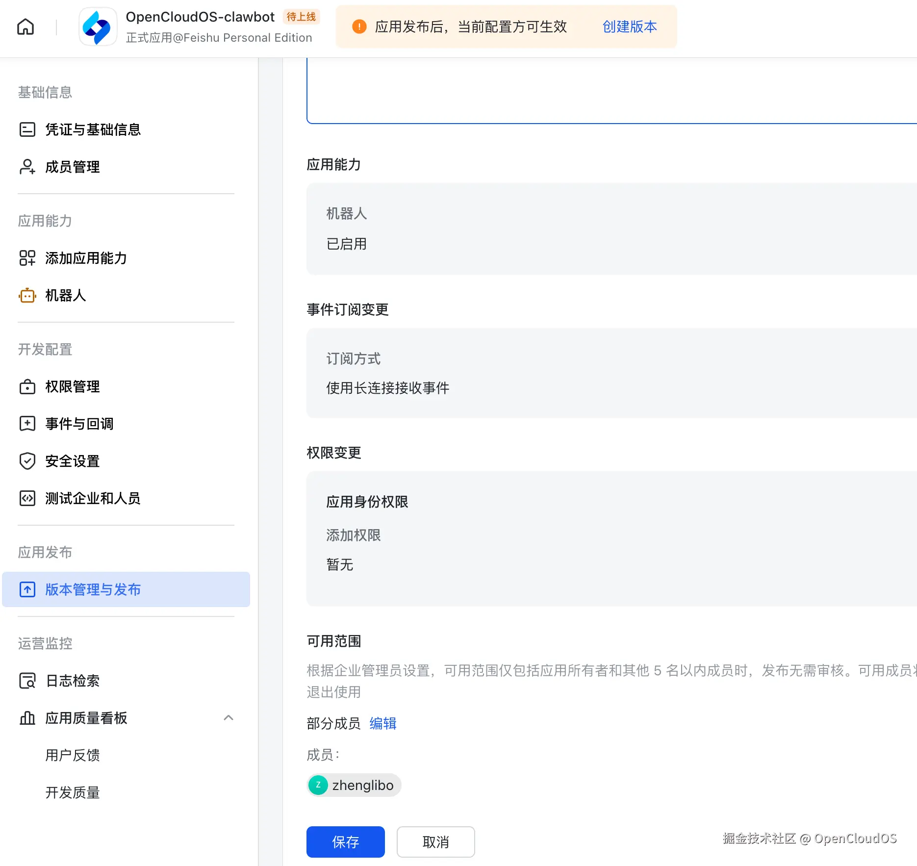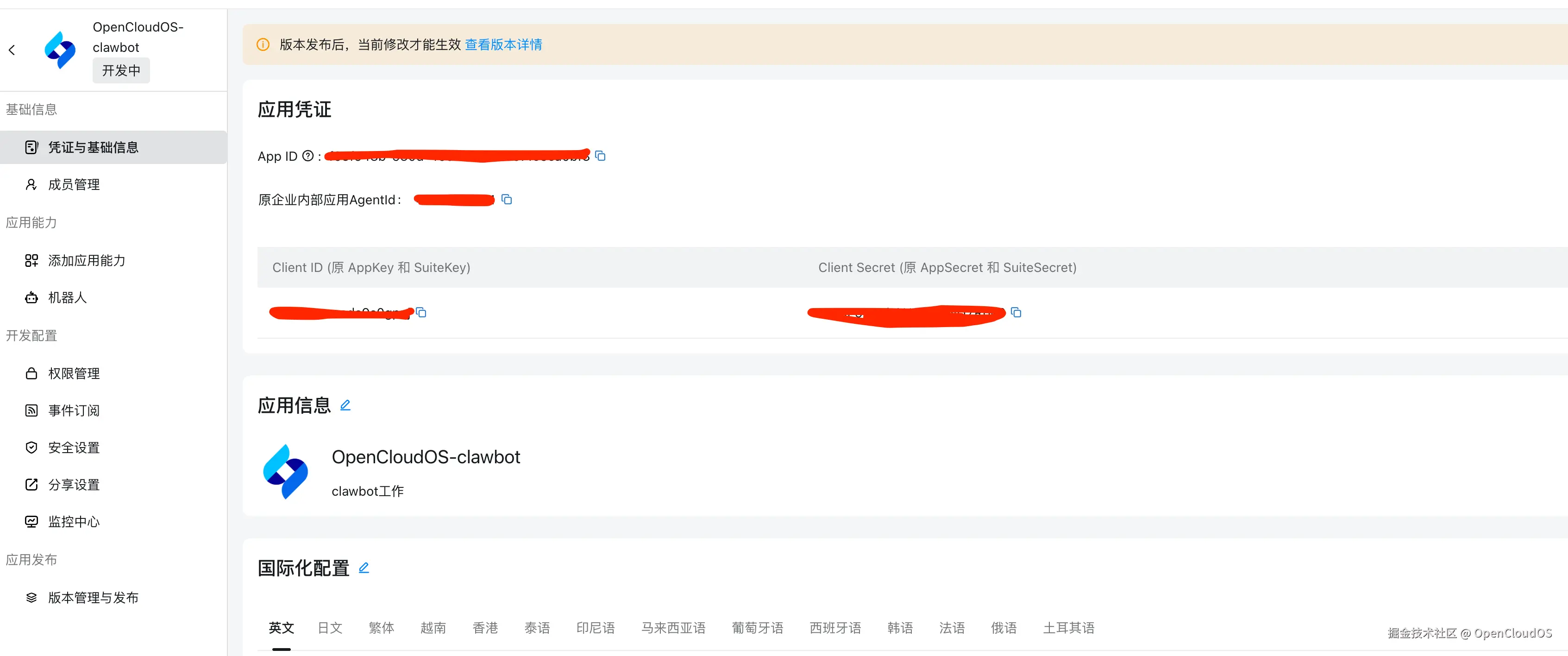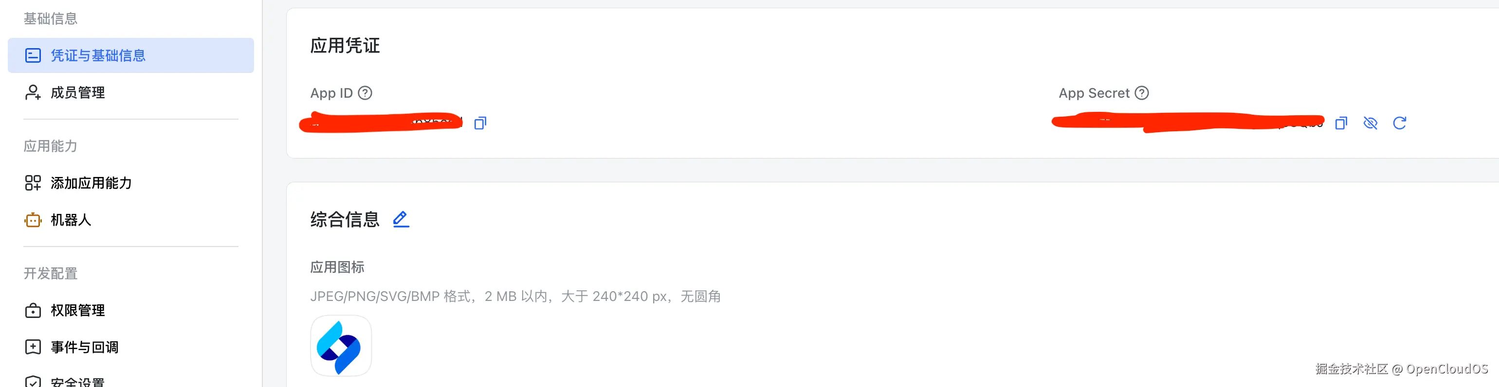 进入凭证与基础信息 页面,记录 App ID / App Secret 同步更新到 openclaw 配置中