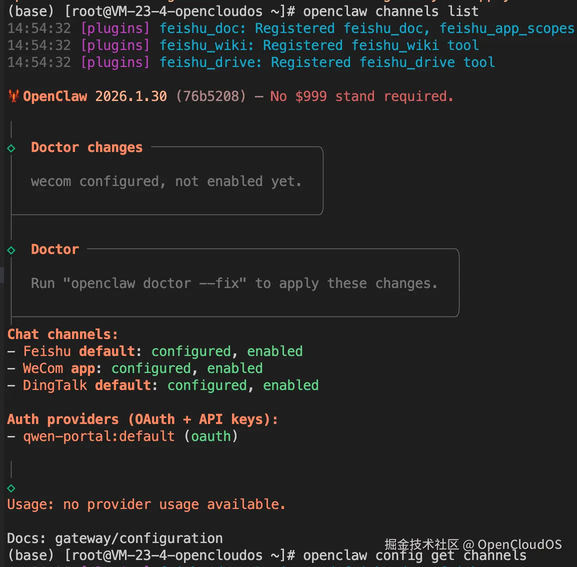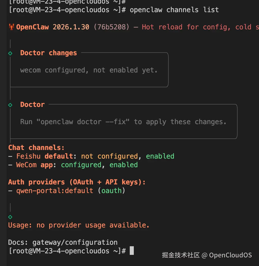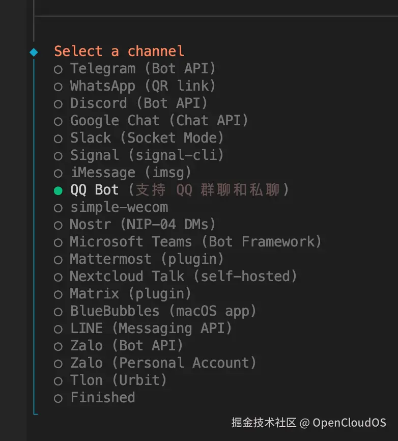 OpenClaw配置流程较多,OpenCloudOS已在上篇内容你的 7x24 "AI 运维同事",OC 9 + OpenClaw 部署及实战指南OpenClaw进行了详细展示,这篇不再赘述。唯一不同的是,如您在2.1章节中执行了指定IM安装(如企业微信、飞书等),则会在IM配置环节的列表中,看见该可选项。