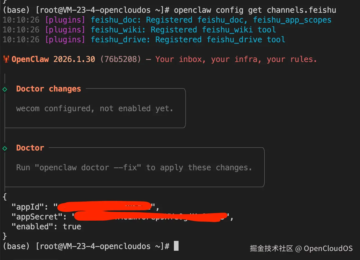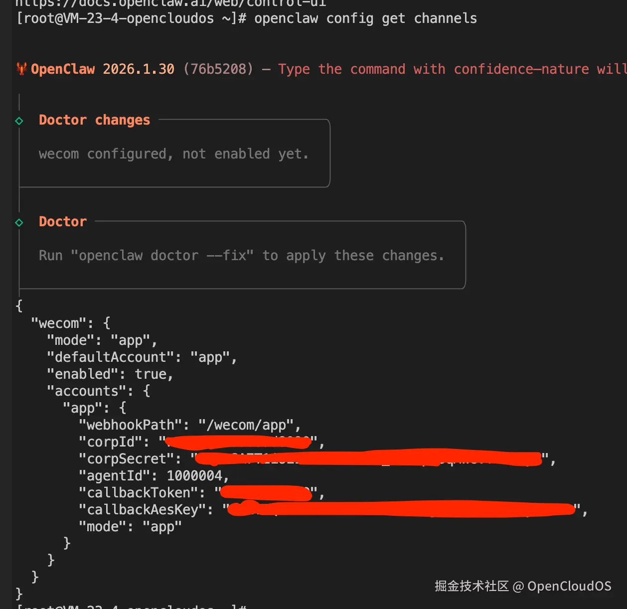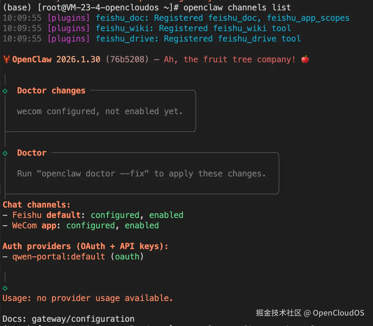 OpenClaw配置流程较多,OpenCloudOS已在上篇内容你的 7x24 "AI 运维同事",OC 9 + OpenClaw 部署及实战指南OpenClaw进行了详细展示,这篇不再赘述。唯一不同的是,如您在2.1章节中执行了指定IM安装(如企业微信、飞书等),则会在IM配置环节的列表中,看见该可选项。
