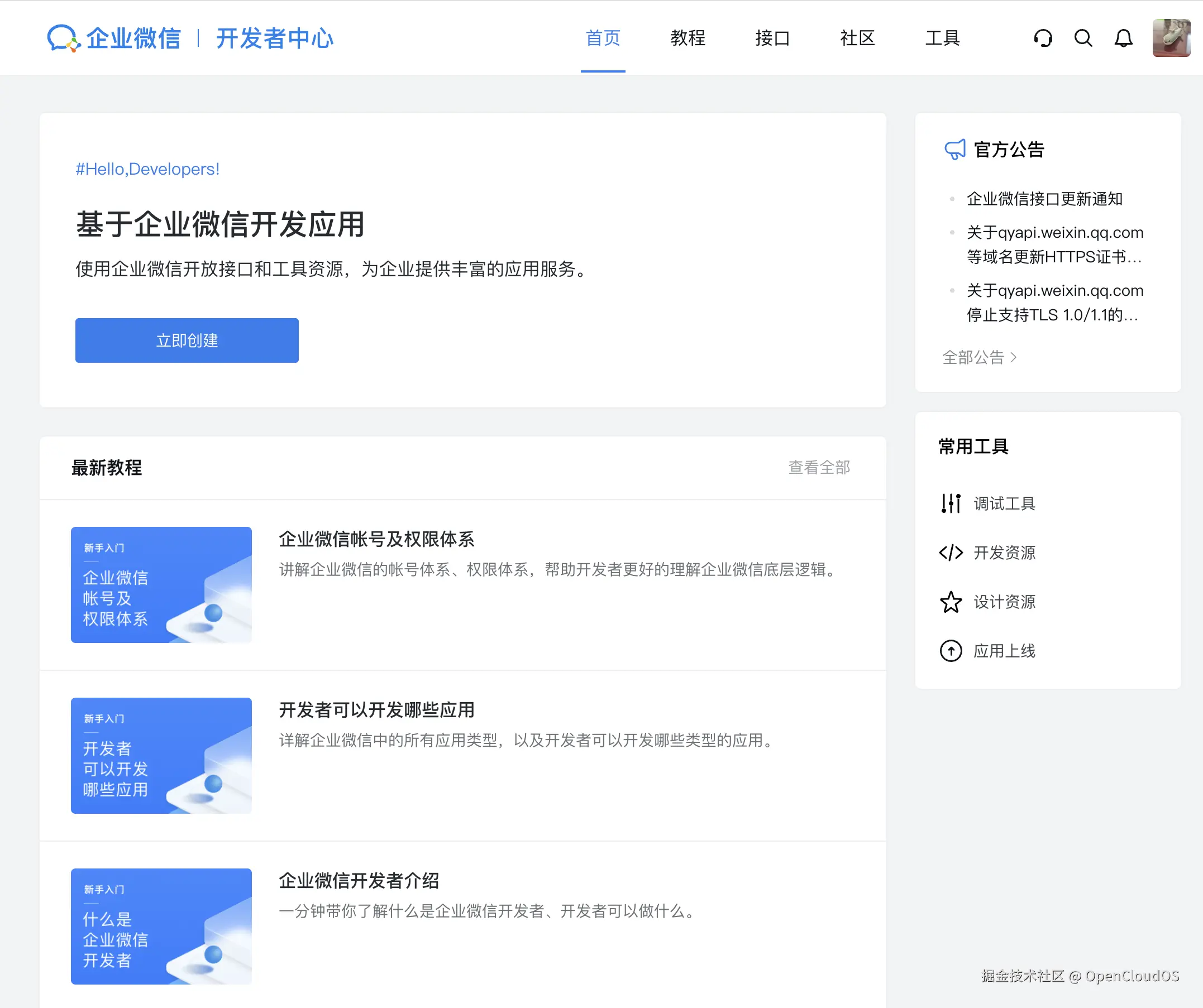 接下来需要在企业微信里创建一个一个应用,这一步需要首页 - 企业微信开发者中心先在这里创建一个应用。