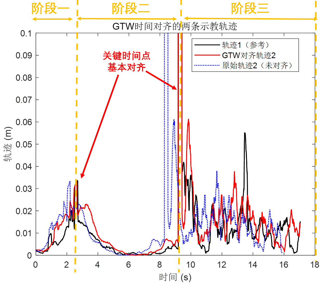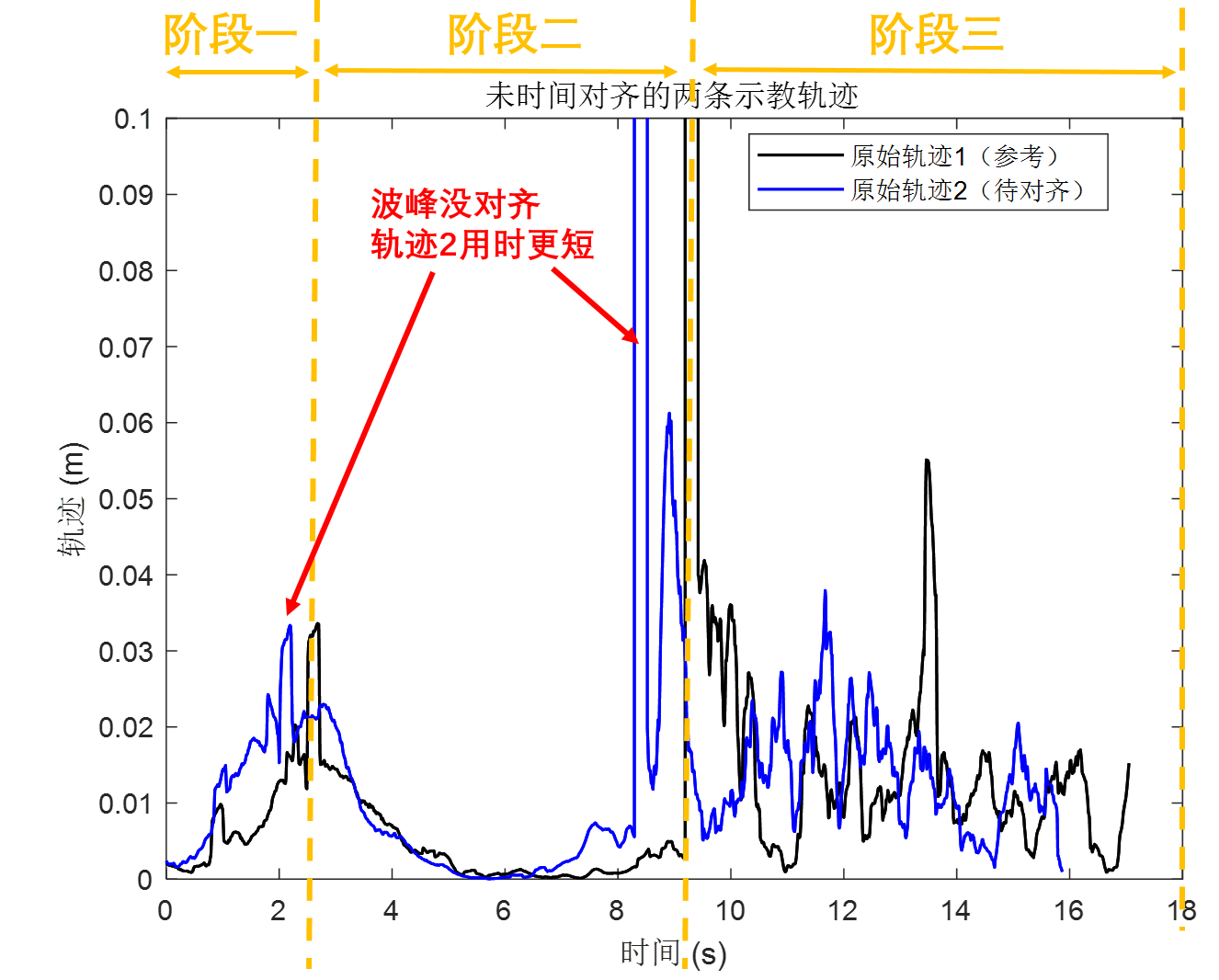 可以看到黑色的线条是第一条示教数据,和蓝色的第二条示教数据是没有对齐的,很明显的两个波峰没有对齐,也就是第二条示教过程速度太快了,明显比第一条数据超前了。如果数据不对齐直接进行示教学习是不行的,数据不一致学到的结果是错误的。