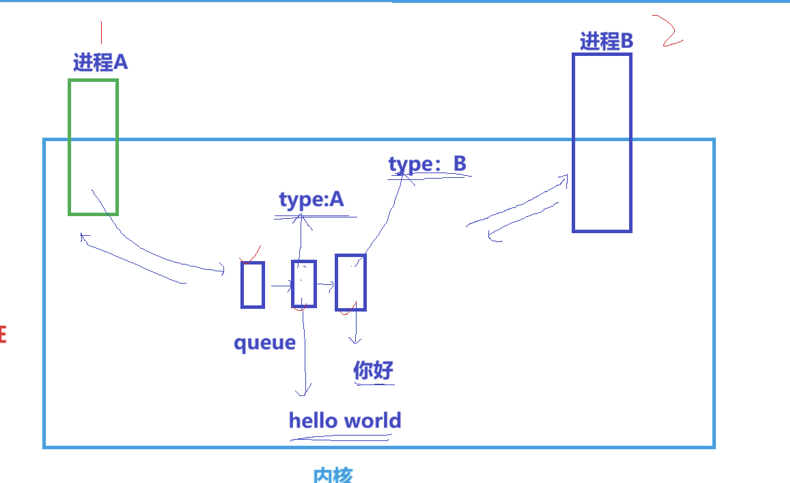消息队列同样是属于system V标准下的一致进程间通信,但是于共享内存不同的的是,它并不是一整块的内存块,在内存当中是通过一个队列进行维护一些特定大小的数据块,通过类型进行区分二者究竟是谁发送的消息.