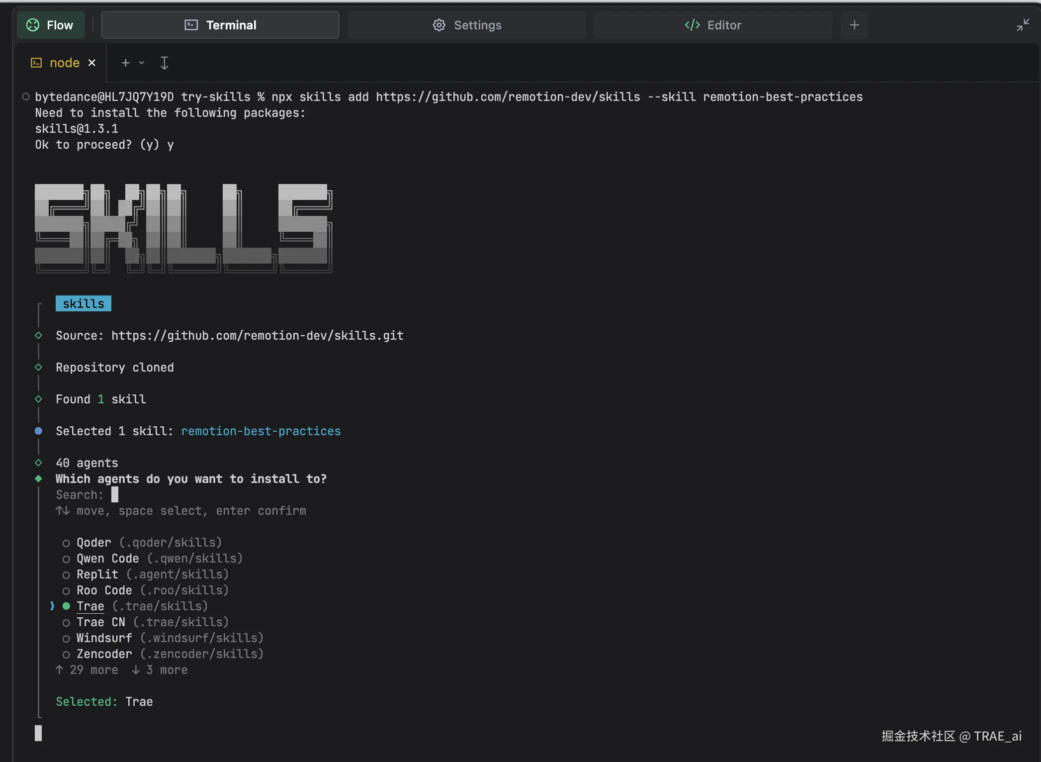 在 "Which agents do you want to install to", 选择 「TRAE 国际版」或者「TRAE 中国版」