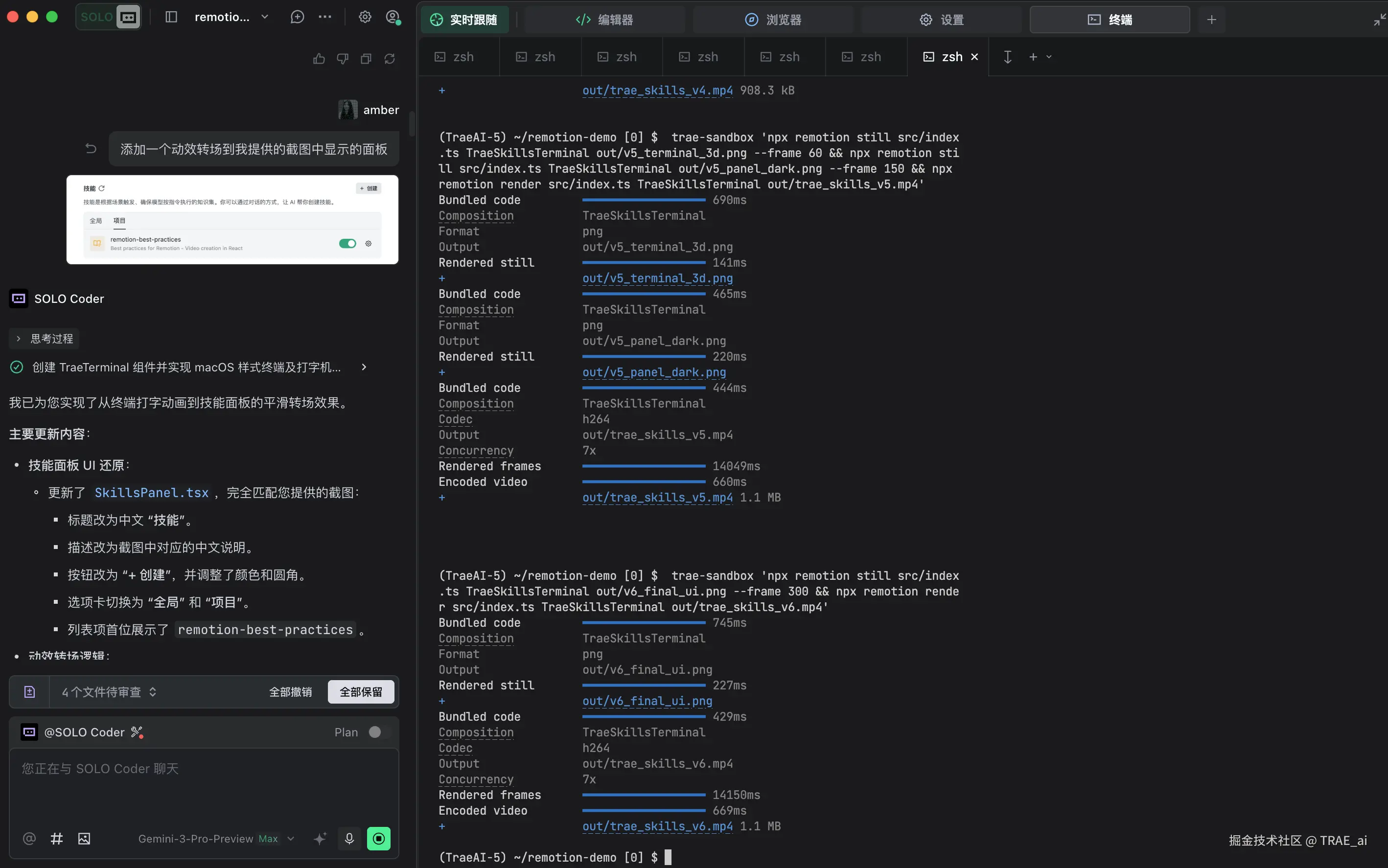 在 TRAE 中使用 Remotion 的 Agent Skills 可以让你实现通过自然语言来 vibe code 出一个完整视频。你可以直接描述你想要的元素:动画、转场、UI 效果等等,TRAE 就可以帮你在几分钟内生成 Remotion 代码,完全不用打开传统的视频编辑器!