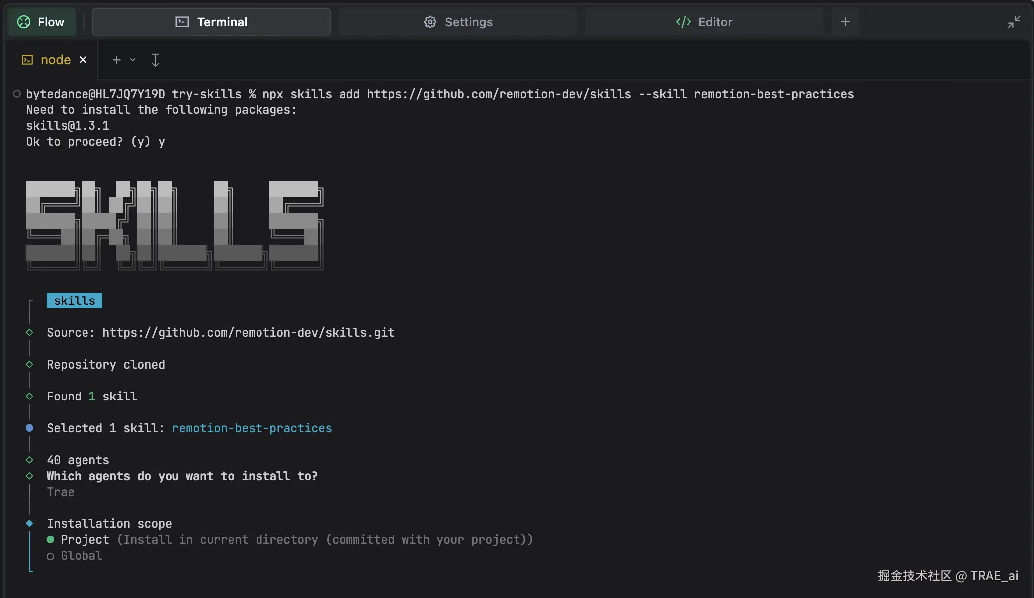方式 2:用 Skill.sh 命令行安装,直接把下面的指令复制粘贴到 TRAE 的终端里面