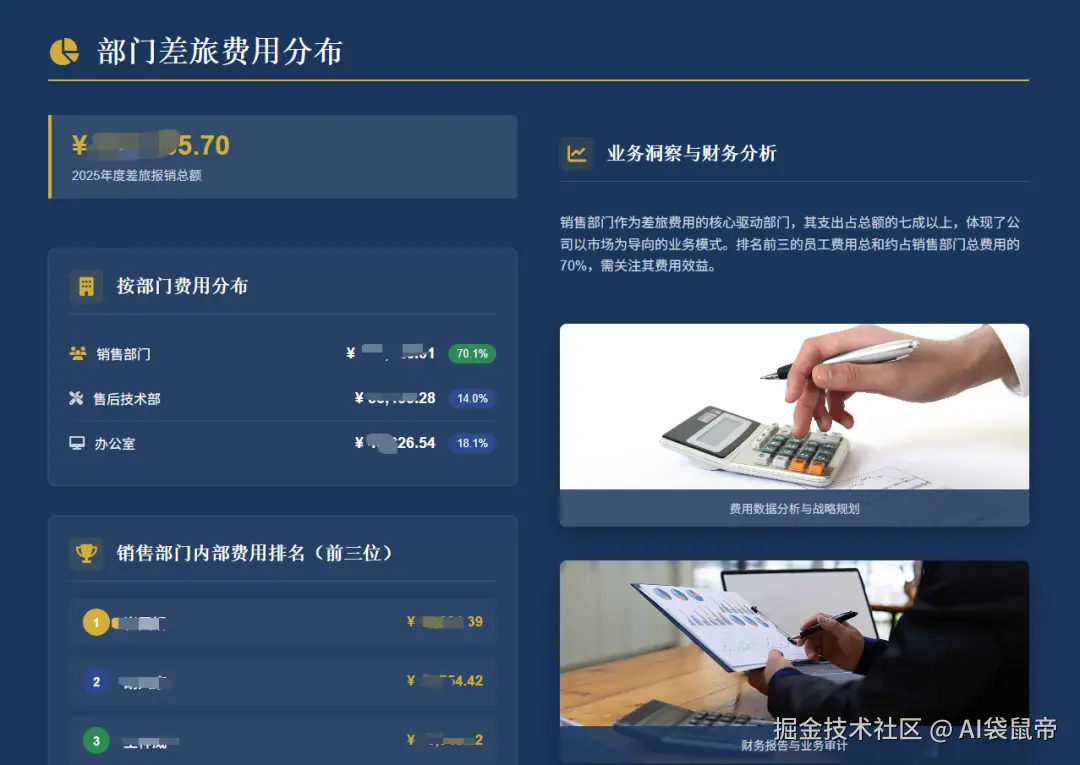 不同部门差旅费用的报销统计,报销最高部门的人员统计,以及针对差旅费用的优化建议都有,这一套很符合我们汇报工作时的演讲逻辑了。