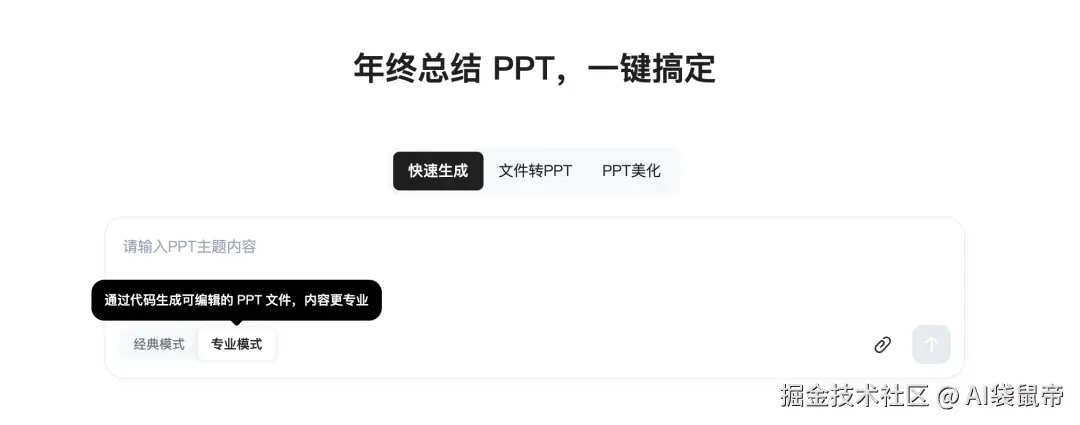 从最开始的先让AI生成markdown的大纲+内容,再丢给某些工具转PPT,到现在上传文件,给个主题就能一键生成精美PPT。