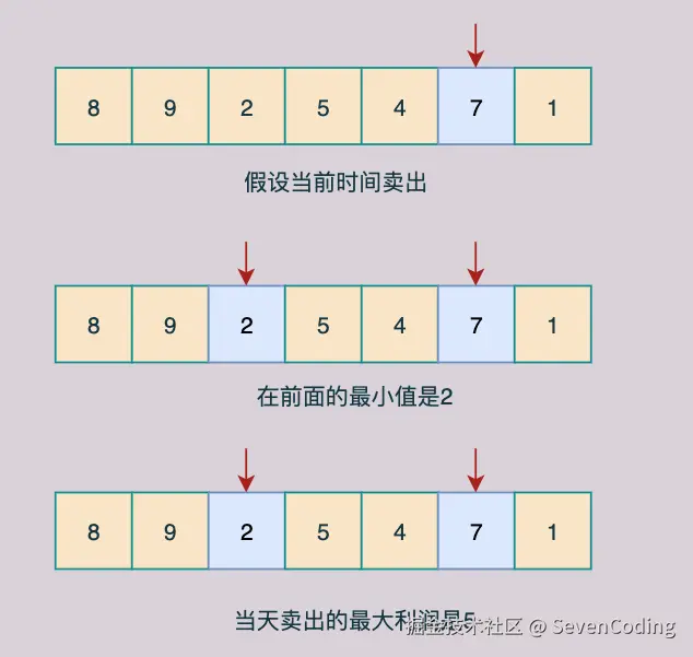 示例1: 输⼊:[8,9,2,5,4,7,1] 返回值: 5 说明: 在第3天(股票价格 = 2)的时候买⼊,在第6天(股票价格 = 7)的时候卖出,最⼤利润 = 7-2 = 5,不能选择在第2天买⼊,第3天卖出,这样就亏损7了;同时,你也不能在买⼊前卖出股票。