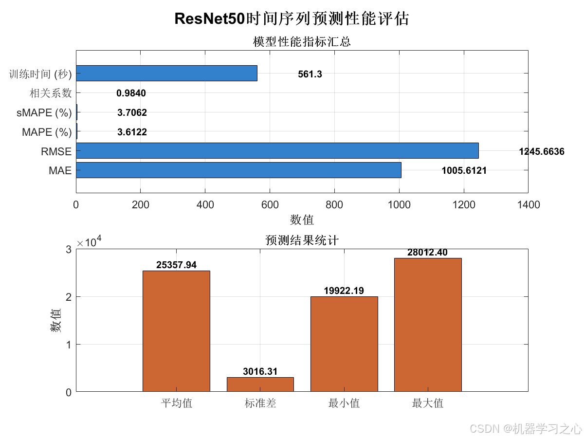 该代码旨在探索深度学习模型在时间序列预测任务中的应用 ,特别是将计算机视觉中表现优异的ResNet50架构 迁移至时序数据分析。通过结合残差网络(ResNet) 与递归神经网络(RNN) 的思想,构建混合网络结构,以捕捉时间序列中的长期依赖与非线性模式,提升预测精度。