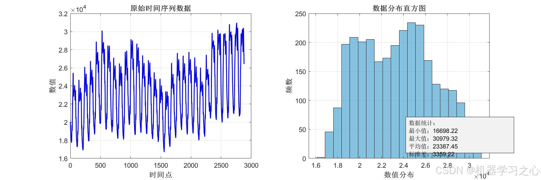 - 数据导入与可视化:从Excel读取时间序列数据,并绘制原始数据与分布直方图。