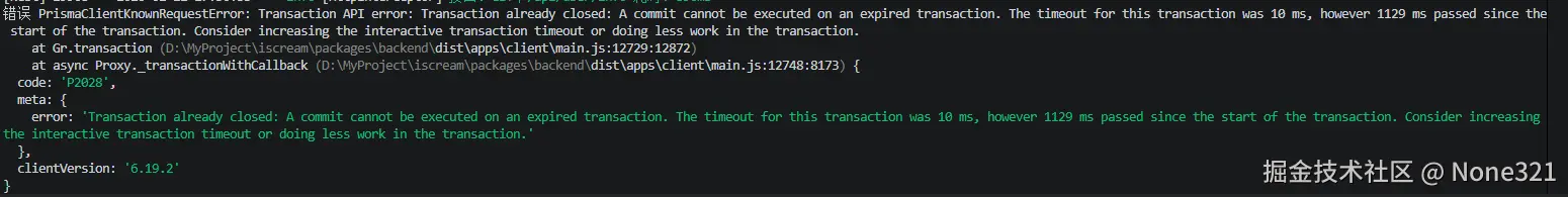 通过上述代码测试得到了报错信息 也就是Prisma的事务执行超时报错 也证明我们的事务已经正常开启了