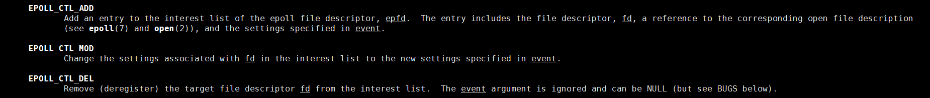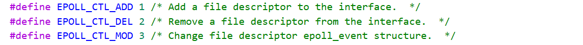 这三个选项就是大写的宏值,代表要对指定的fd执行具体的操作,为op提供的选项 。EPOLL_CTL_ADD代表添加新的fd到监控列表,EPOLL_CTL_MOD代表修改已监控fd的事件设置,EPOLL_CTL_DEL从监控列表移除fd。
