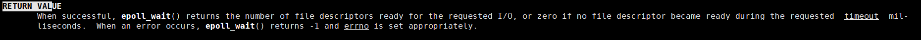 epoll_wait的返回值成功了就返回已经就绪的文件描述符的个数,没有就绪的文件描述符就返回0,出错了返回-1设置错误码。这一点和poll,select是一样的。