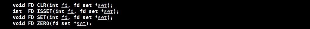 FD_CLR将指定的fd清除,FD_ISSET判断指定的fd是否在位图中,FD_SET将指定的fd设置到位图里,FD_ZERO将位图全部置为0。