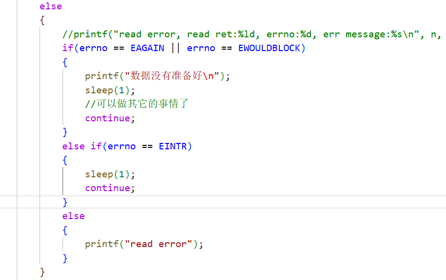 那也就是说,read函数如果是非阻塞行为,那它出错的情况就不只是单纯的"出错"了。它包含多种情况,一种是真的出错了,另一种是其它情况导致出错了,被迫返回0(就像这里的资源未就绪)。那read函数的返回值就只有这三种情况,最后一种情况要如何区分呢?