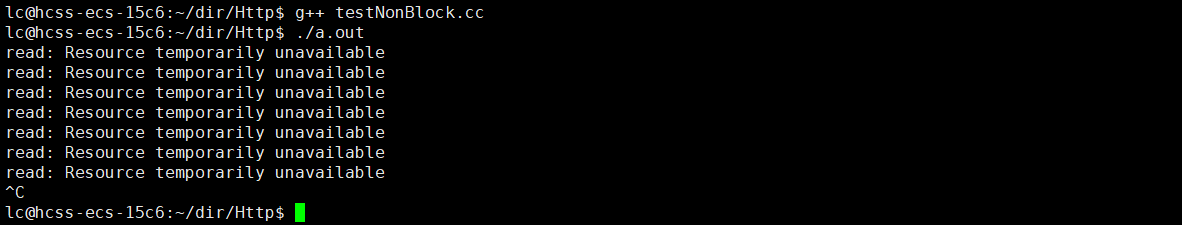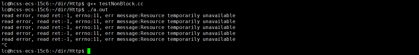 这里果然是非阻塞的 ,只不过这里它报错了,它说资源暂时不可用。当进程非阻塞之后,资源不存在就会已出错的形式返回 ,那这种出错算真的"出错"吗?当然不算了。