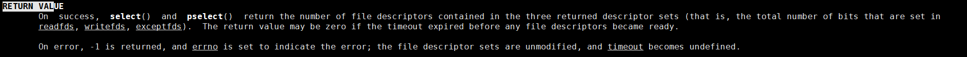 如果timeout为NULL,代表阻塞式等待,如果timeout指向的变量内容设置为{0,0},代表等待0秒,即非阻塞式等待,如果是{5,0}(也可以是其它值),代表在5秒内阻塞等待,5秒之后触发一次timeout,即成为非阻塞式等待,等到下一次再次调用select时,就会再等待5秒。