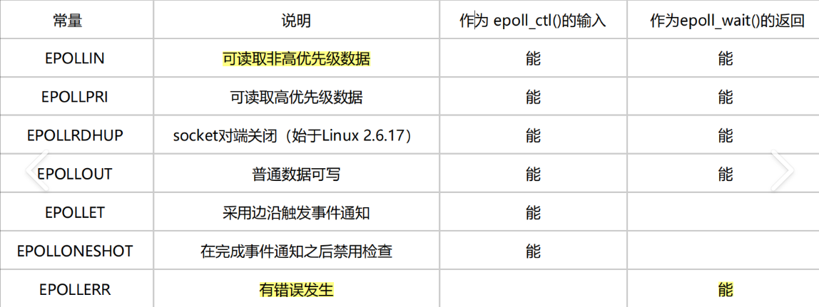 那红黑树表达的是什么意思呢 ?表达的是内核需要关心哪些fd上的哪些事件!那epoll都有哪些事件呢?