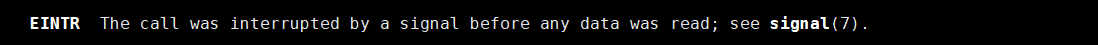 还有一种情况,就是因为中断信号而导致返回值小于0,当进程刚执行到read函数的时候,因为信号中断而执行中断方法,执行完之后再从进程中断的位置开始执行 ,但是此时不会二次调用read函数了,就会读取出错。这个时候errno的值就是EINTR,表示因为中断而出错。