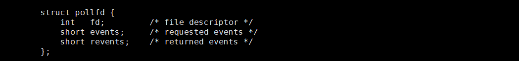 那如何知道哪些事件已经发生了呢 ?通过fd和revents就可以知道了。fd代表的是文件描述符,revents也是一个位图,通过位图就可以知道哪些事件已经发生了。