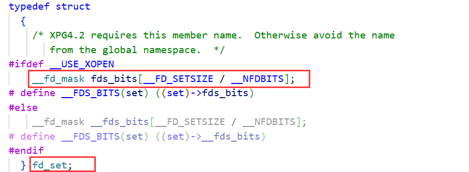 最后就是中间的3个参数了,这三个参数的类型都是 fd_set(文件描述符集)。select一次可以等待多个fd,那它就要将等待的fd进行保存,那如何保存呢?