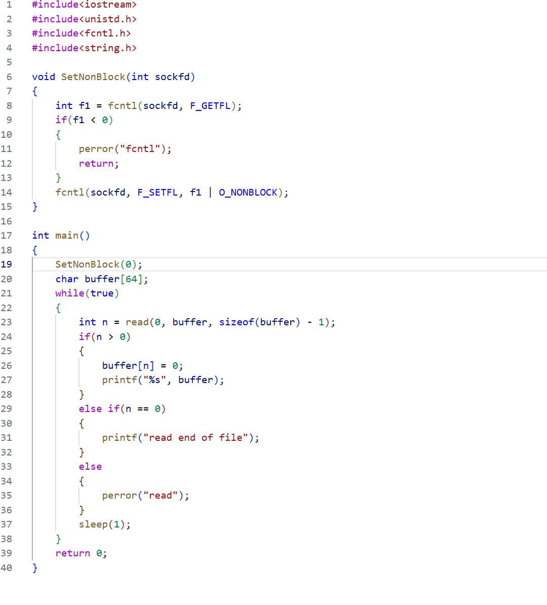 为了达到这个目的,就要更改OS里的标志位了 ,毕竟linux下一切皆文件,只要更改OS里文件里的标志位,将它设置为非阻塞的,即使应用层是阻塞式的,它的行为也是非阻塞的。