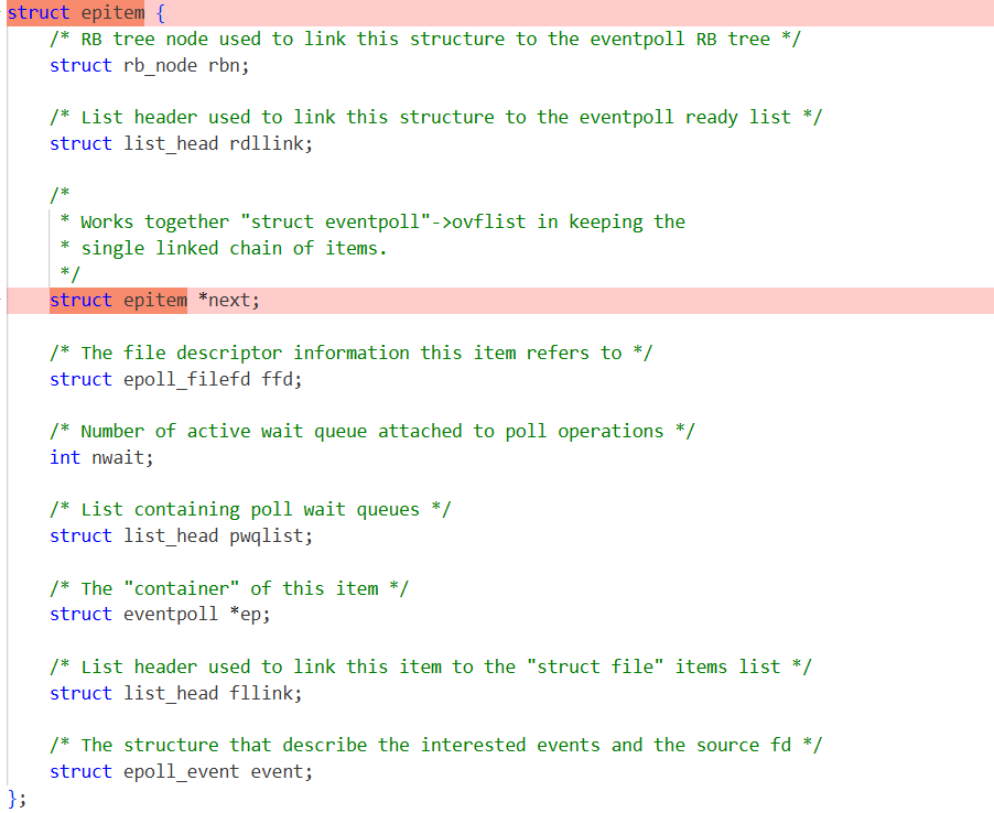 而struct eventpoll中的struct list_head rdllist指向struct epitem中的struct list_head rdllink。这不就既属于红黑树又属于队列了吗!