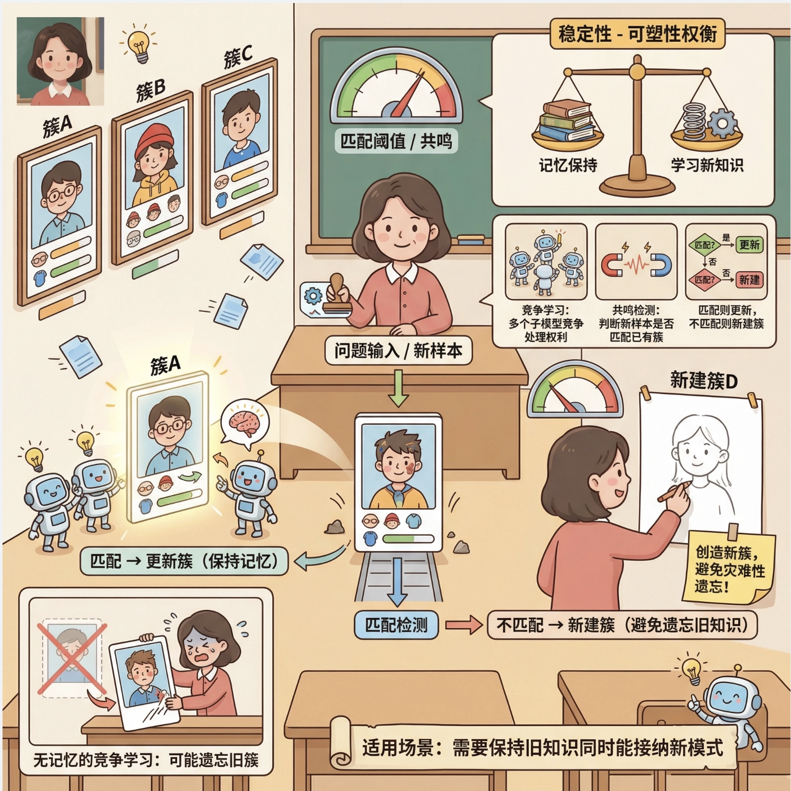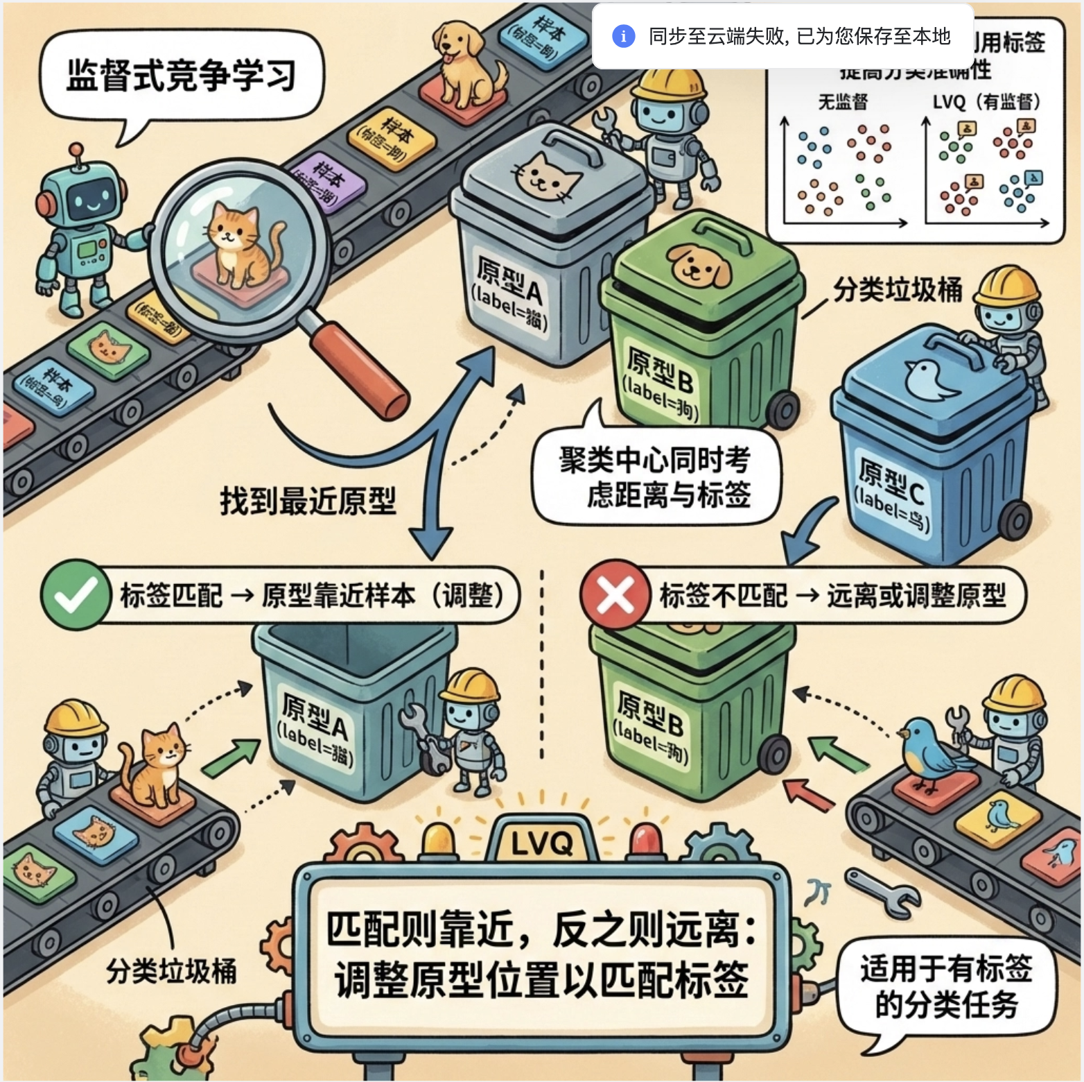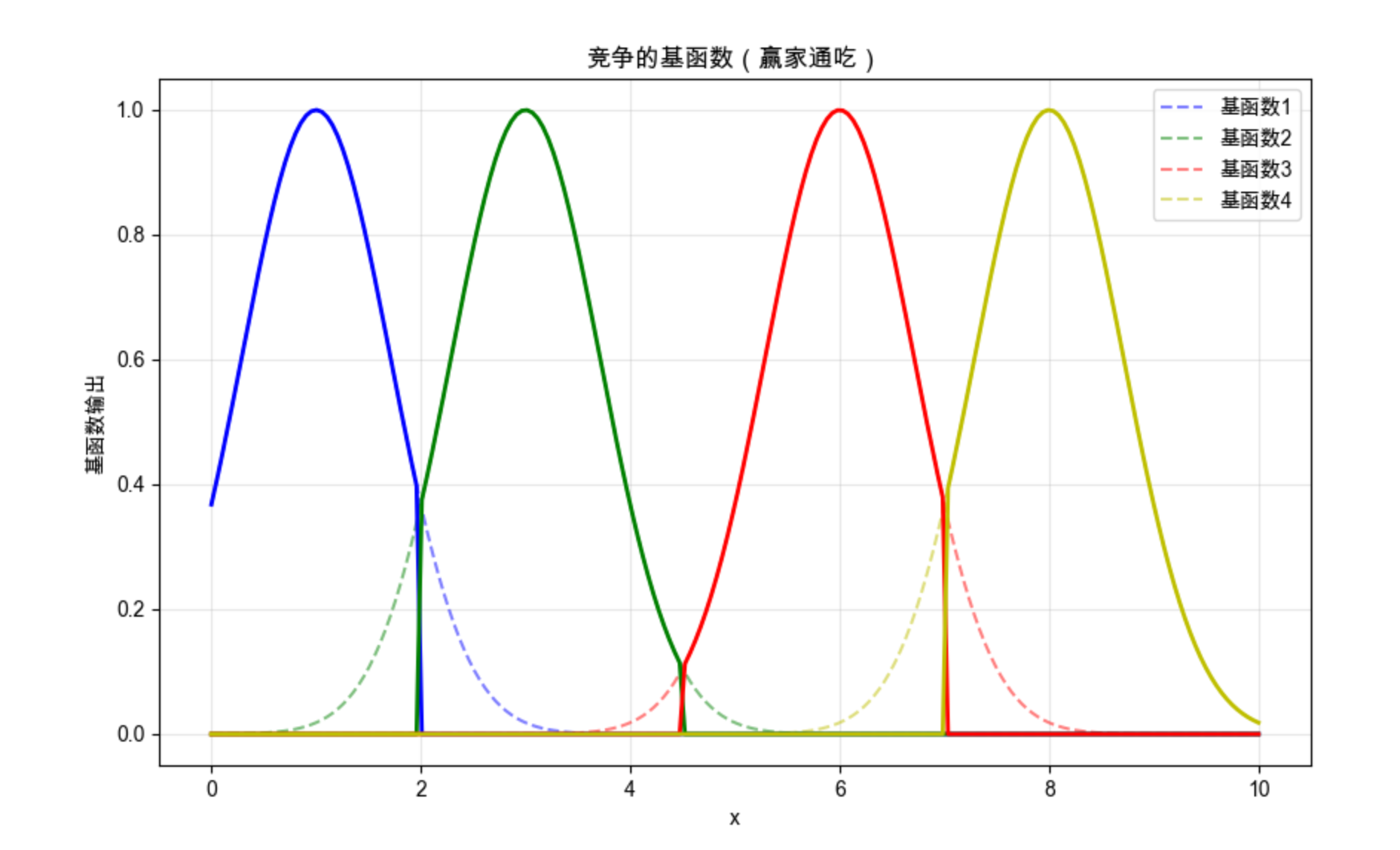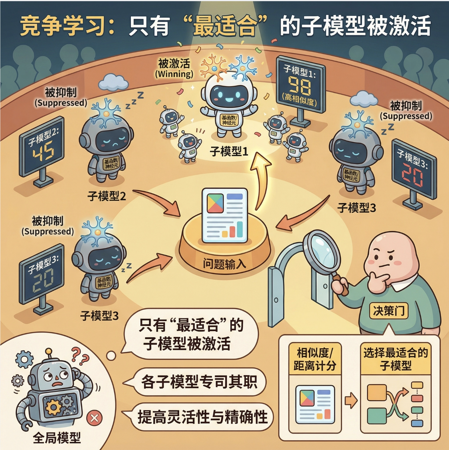 竞争学习是局部模型的核心思想之一:多个子模型(神经元 / 基函数)之间 "竞争" 处理数据的权利,只有 "最适合" 处理当前数据的子模型会被激活,其他则被抑制。