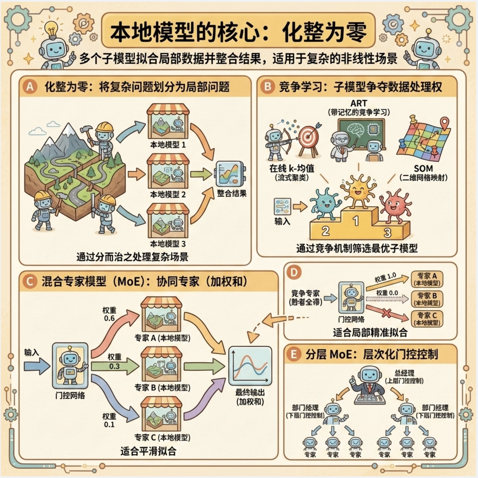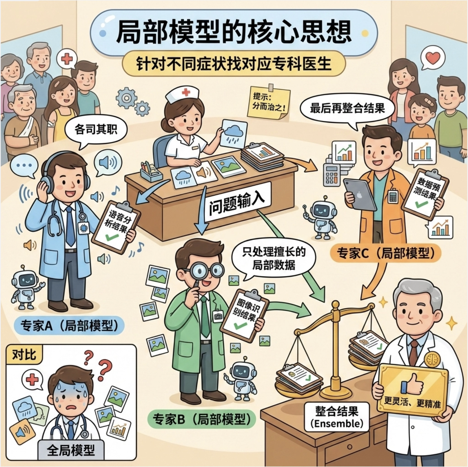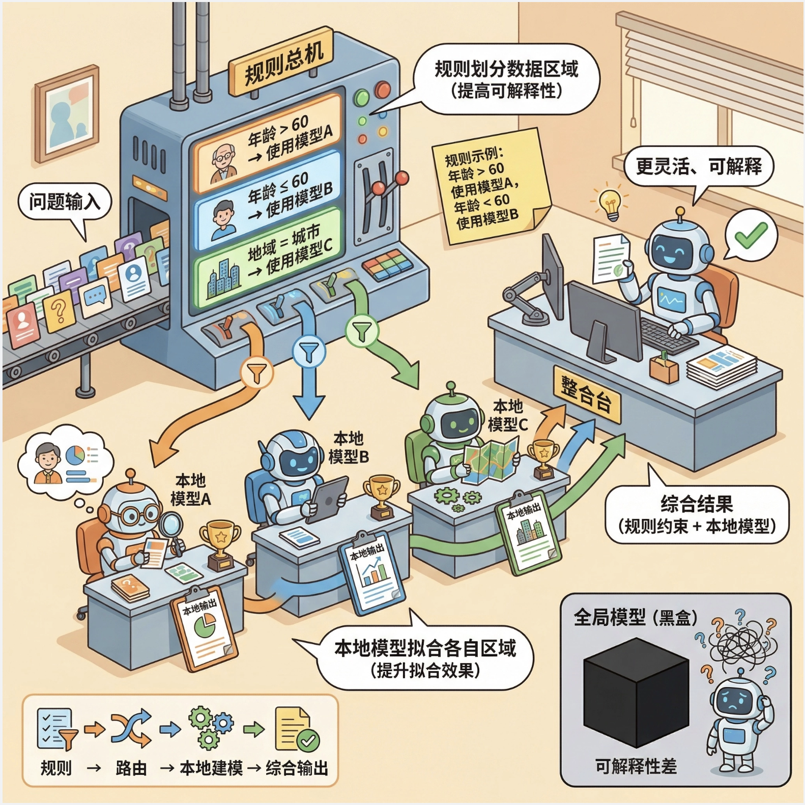 核心比喻 :就像一个公司处理复杂业务,不会让一个员工干所有活,而是分成多个部门(局部模型),每个部门负责一块业务,最后总经理(整合规则)汇总结果。